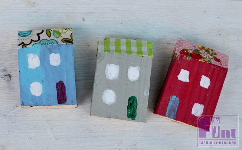 Покрасьте стены домиков в разные цвета (мы использовали серый, вишнёвый и голубой оттенки). Затем приклейте лоскутки ткани или декоративную ленту на остроконечные крыши при помощи клея ПВА или горячего клеевого пистолета.