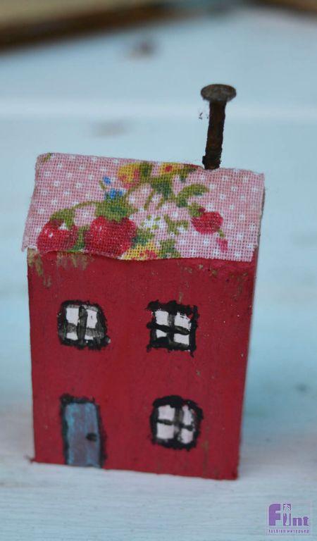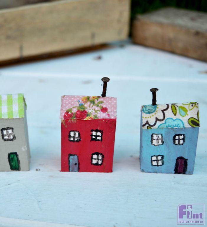 Завершающим этапом создания милых домиков станут дымовые трубы, в роли которых будут выступать небольшие гвоздики. Вбейте их в «крыши», чтобы создать иллюзию дымоходов.