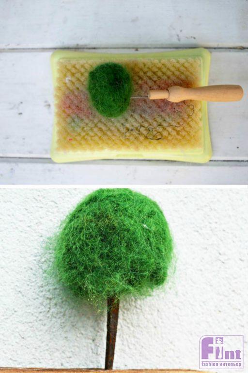 Приступаем к изготовлению войлочного дерева. Обычно загородные дома окружены красивыми деревьями, которые являются неотъемлемой частью загородного ландшафта. Наша «улица» на ключнице также будет украшена небольшим деревом. Для его изготовления используйте комочек зелёной валяной шерсти, или используйте обрезок губки зелёного цвета. В качестве ствола мы использовали один из больших гвоздей, приготовленных для крючков.