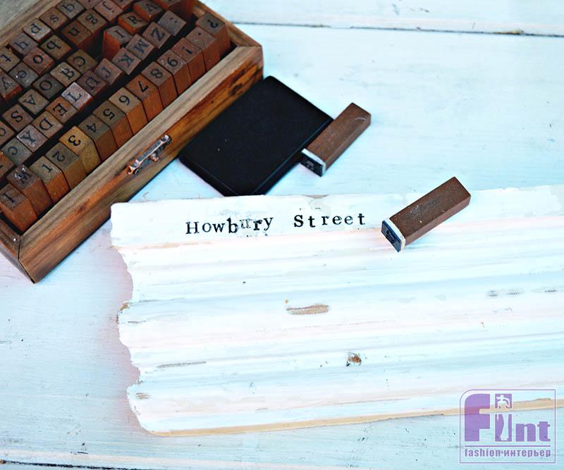 Как мы уже говорили в начале нашего мастер-класса, будет здорово, если вы подпишете свою ключницу, нанеся на её поверхность надпись с названием вашей улицы. На основу ключницы (в нашем случае, это обломок широкого фигурного плинтуса) при помощи буквенных штампов мы нанесли название улицы. Буквенные штампы – довольно редкая вещь, поэтому вы можете просто написать название тем же чёрным маркером, которым вы декорировали домики.