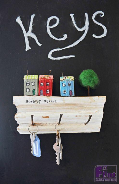 Когда мы говорим, что эта прекрасная настенная ключница сделана из хлама, мы нисколько не преувеличиваем. На изготовление ключницы буквально пошли обломки деревянных изделий, крошечные кусочки материи, ржавые гвозди. Всё это поможет нам сделать забавную ключницу, имитирующую небольшой фрагмент улицы с загородными домиками. Будет здорово, если у вас получится подписать вешалку, отобразив на ней название своей улицы, а на изготовление пойдут выброшенные обрезки материалов, из которых сделан ваш дом. Если же написать на ключнице адрес своих друзей, близких или знакомых, то она станет для них отличным подарком.