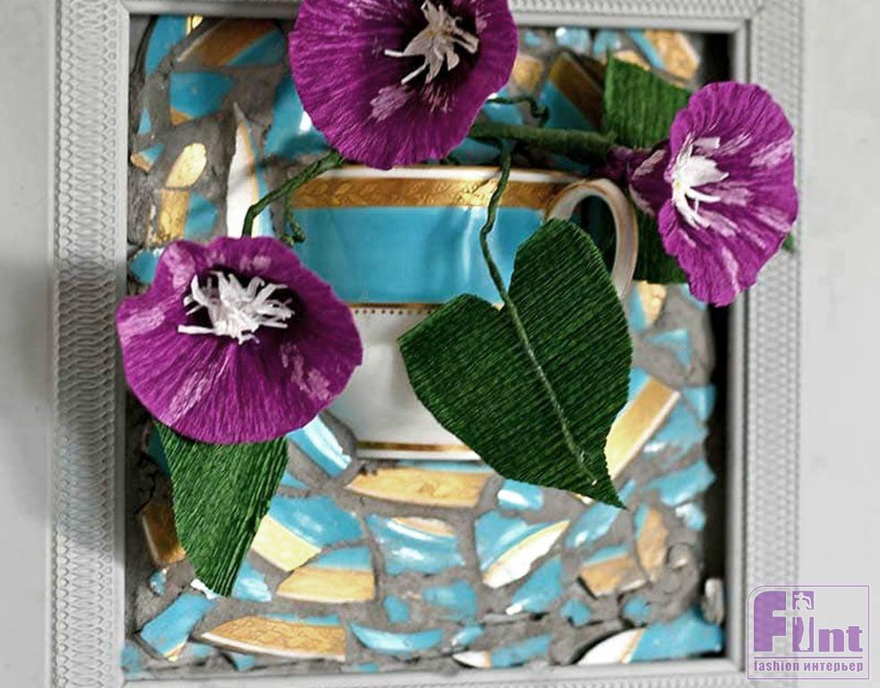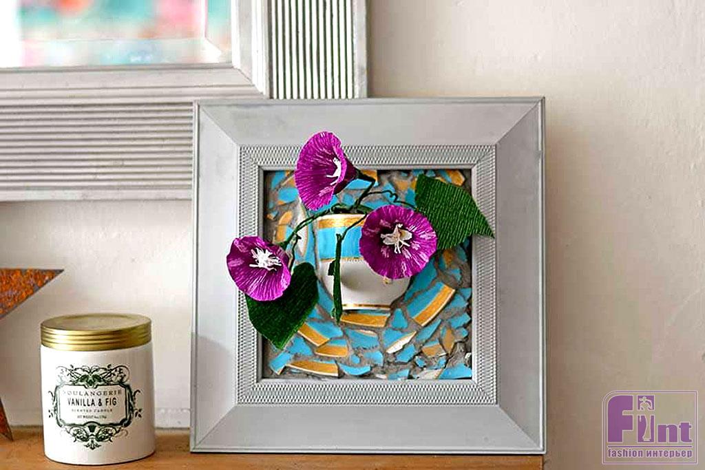 Чтобы закончить настенную вазу, поместите подложку с приклеенной половинкой чашки и нанесённой мозаикой обратно в рамку и подберите подходящие цветочки для вашей вазочки. Это могут быть короткие живые цветы, суккуленты, или самые различные искусственные цветы и растения. Такая самодельная вазочка станет не только прекрасным украшением вашего дома, но и может выступить в роли прекрасного подарка, сделанного своими руками, для ваших близких и друзей.