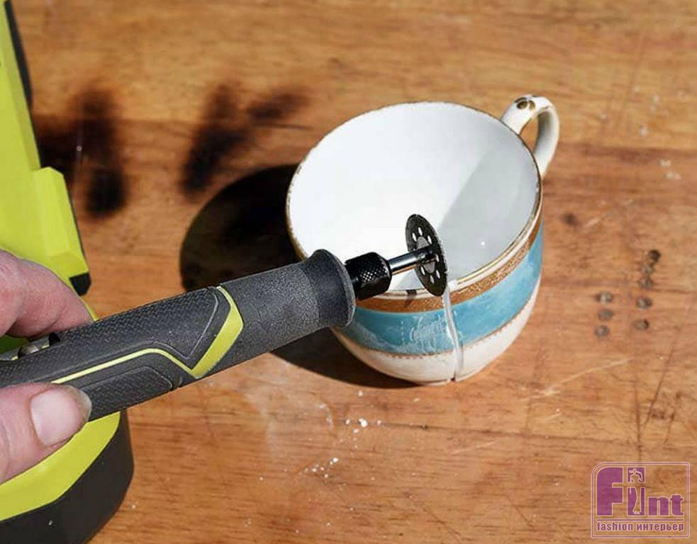 Затем разрежьте фарфоровую чашку пополам с помощью гравера. С алмазным отрезным диском фарфор режется очень легко. Чем толще керамика, тем дольше она будет разрезаться. Тонкую фарфоровую чашечку можно разрезать пополам буквально за пару минут. В идеале чашку нужно разрезать ровно посередине на две равные половинки.