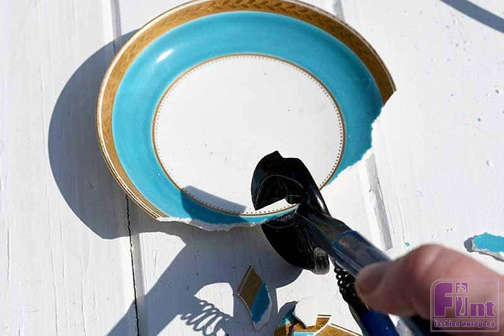 Далее мы приступаем к формированию мозаичного фона для нашей вазы. Для этого вам нужно отколоть от блюдца небольшие фрагменты, используя кусачки для плитки, обычные плоскогубцы или даже простой молоток. Предпочтительнее использовать кусачки для плитки, поскольку с их помощью вы сможете откалывать от блюдца нужные вам по размеру и форме кусочки фарфора. Если вы разбиваете фарфор молотком, сделайте это внутри картонной коробки, чтобы кусочки не разлетались повсюду. Эти работы также лучше проделывать в защитных очках.