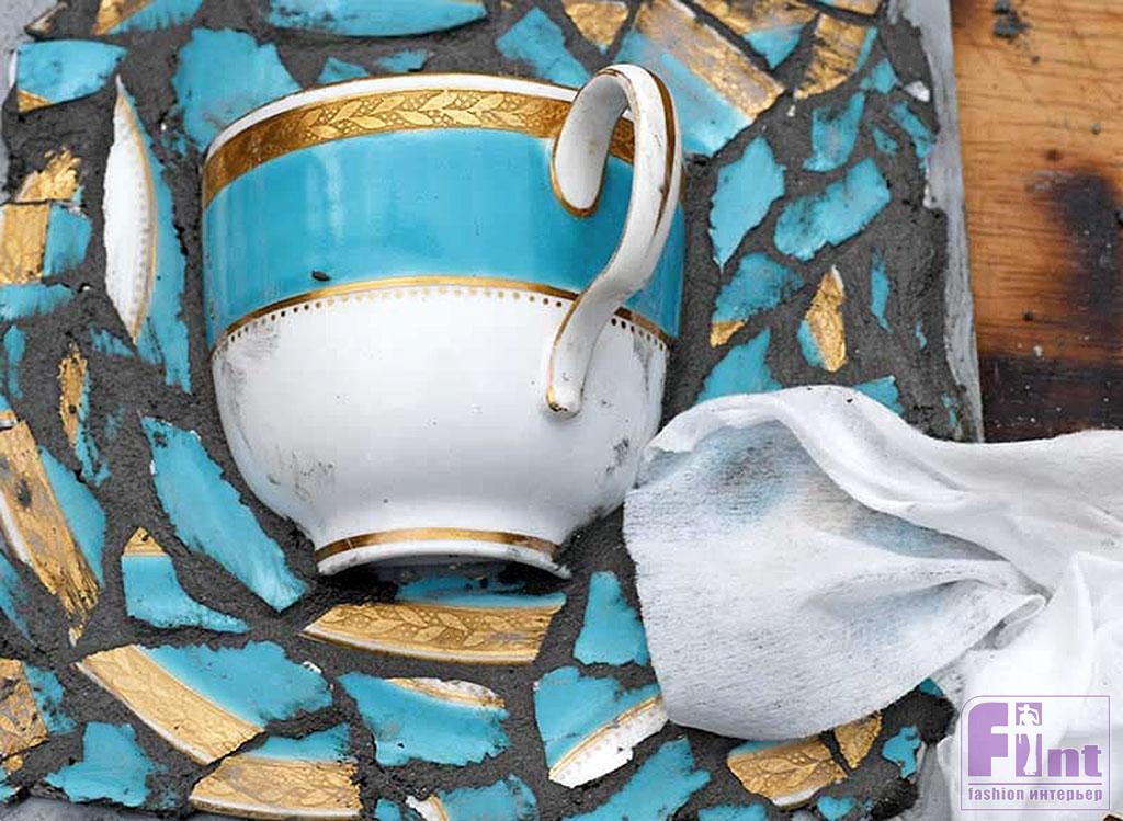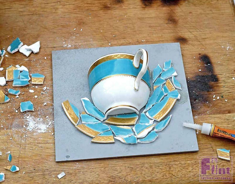 Затем создайте вокруг приклеенной половинки чашки мозаичный орнамент из отколотых фрагментов блюдца. Мозаичный фон создаётся путём приклеивания осколков блюдца на супер-клей. Если у вас нет подходящего блюдца, вы можете оставить этот этап и просто оставить фон, как он есть.