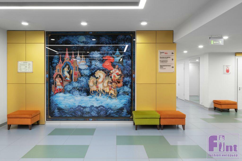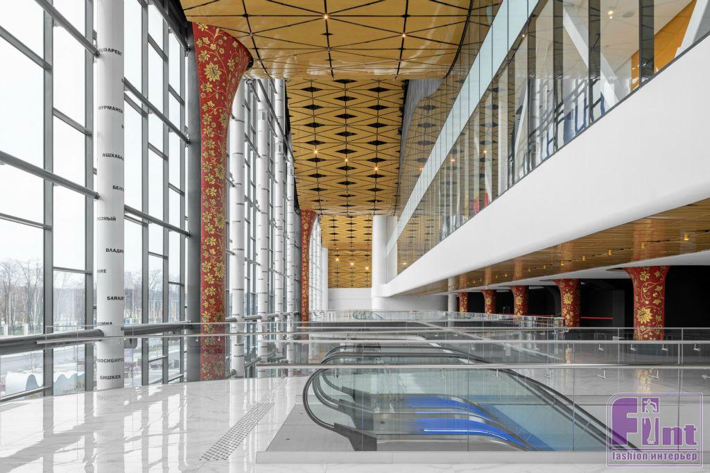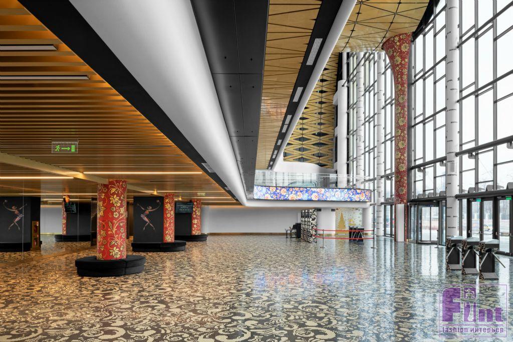 С лаконичной, хотя и не простой, формой здания контрастируют интерьеры комплекса, дизайн которых разрабатывался при непосредственном участии руководителя Центра Ирины Винер-Усмановой. Облик его общественных зон — ориентированная на wow-эффект квинтэссенция «русского стиля» с его яркой декоративностью, цветистым «ковром» покрывающей поверхности холлов и фойе.