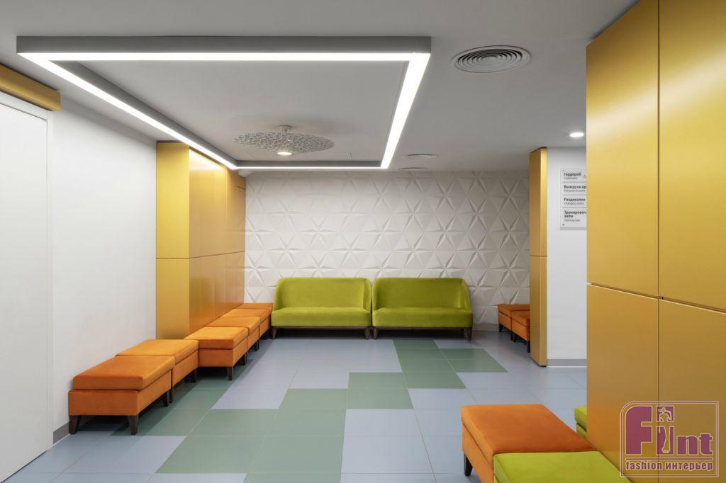 Не меньшее внимание к эксплуатационным характеристикам отделочных материалов потребовалось и в тренировочных залах. Там нужно было не только возвести высокие, более 12 м., перегородки, но и выполнить облицовку, для чего использовали, в частности, гипсокартонные листы. Их применение не только позволило обойтись без усиления конструкции, но и обеспечило помещениям дополнительную шумоизоляцию. Сходное решение — высокие перегородки с облицовкой — применили в зонах вентиляционных шахт.