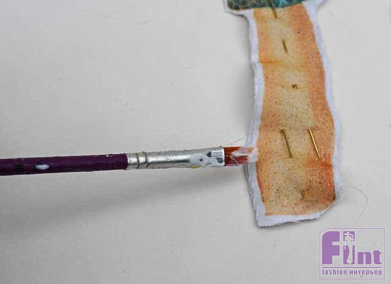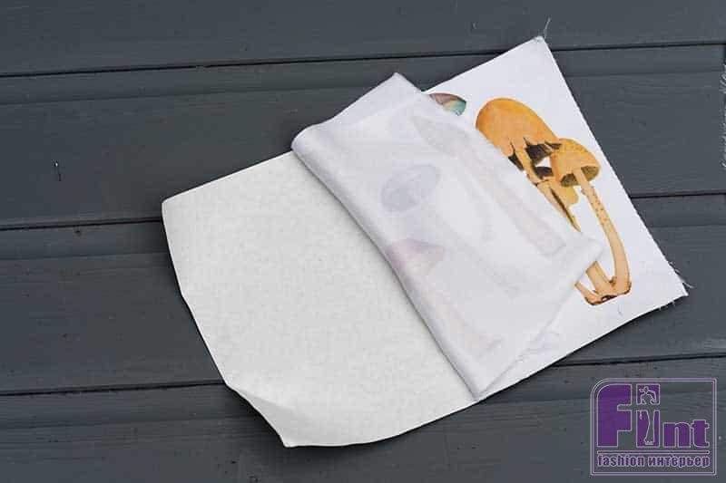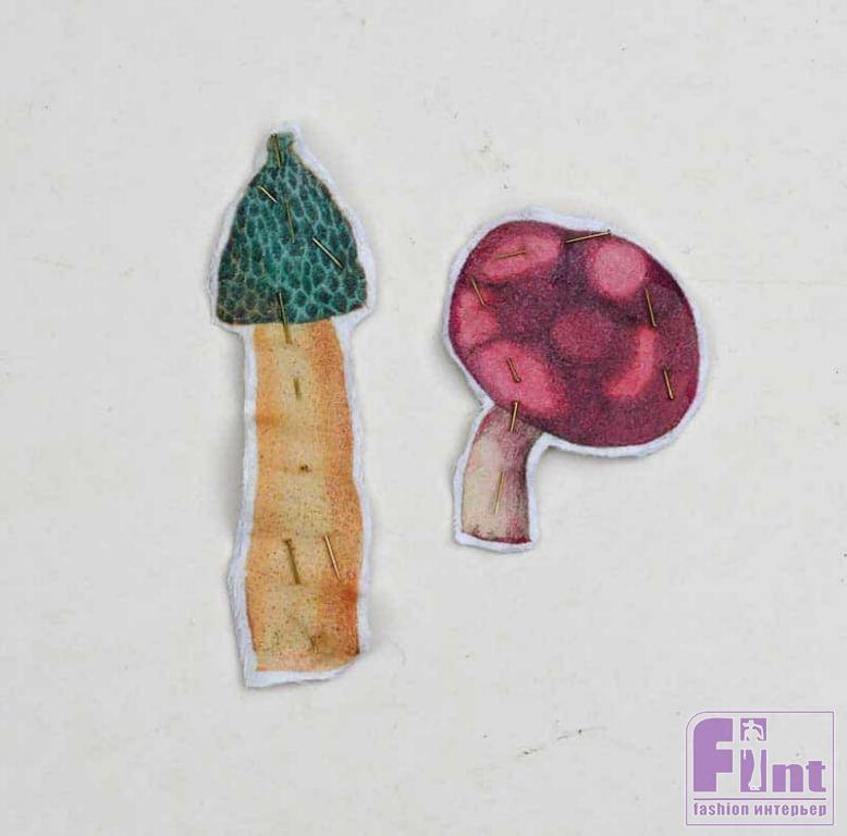 Приложите к распечатке кусок подкладочной ткани, зафиксируйте её булавками и вырежьте напечатанные грибы одновременно с подкладочной тканью, оставляя небольшой запас от изображения (около 5 мм.). Соедините тканевые фрагменты изнаночными сторонами внутрь и сколите их булавками. Затем обработайте края заготовок клеем для предотвращения выпадения нитей.