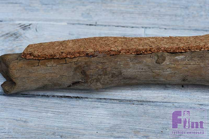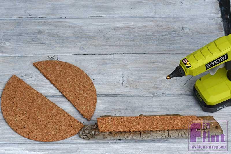 Мы решили, что наши грибы будут отлично смотреться на кусочке старого дерева, найденного нами на берегу моря. Чтобы нам было легче крепить булавками тканевые грибы к основе, на ней следует закрепить небольшой кусочек листовой пробки. Для приклеивания пробки к дереву используйте горячий клеевой пистолет.