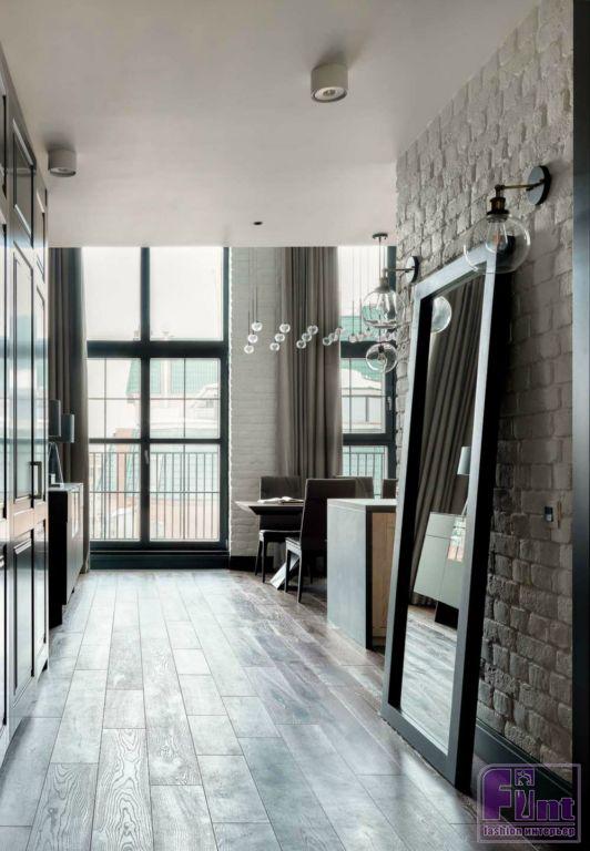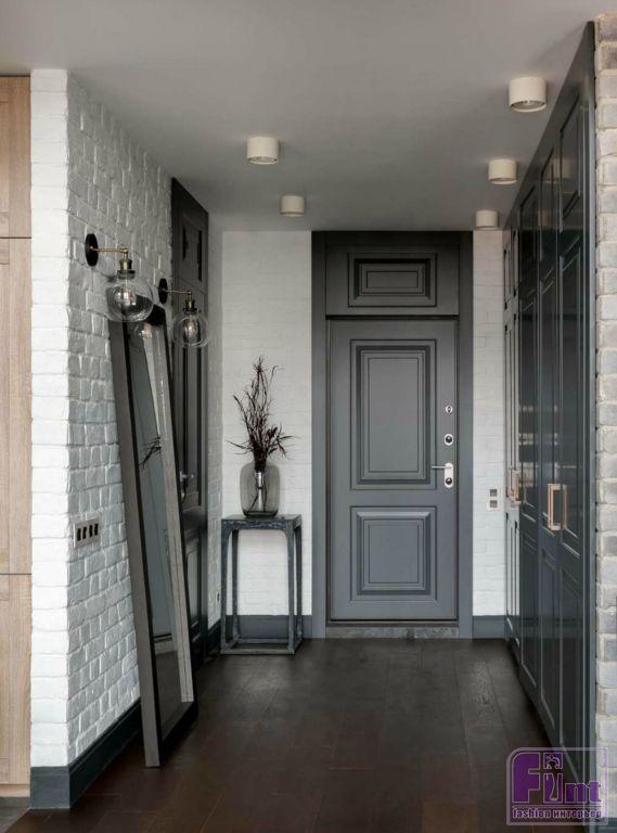 Входная металлическая дверь с внутренней стороны отделана также как и межкомнатные двери. На полу в коридоре выложен инженерный паркет тёмно-коричневого цвета с палубной укладкой. Для отделки стен подобраны сразу три материала – декоративная штукатурка, белый крашеный кирпич и серый кирпич, который переходит с первого этажа на второй. Вдоль лестницы, облицованной деревом, в стену встроена лампочка-подсветка. Ограждение лестничного проёма выполнено металлическими прутьями чёрного цвета. Во всю длину стены установлен встроенный шкаф.