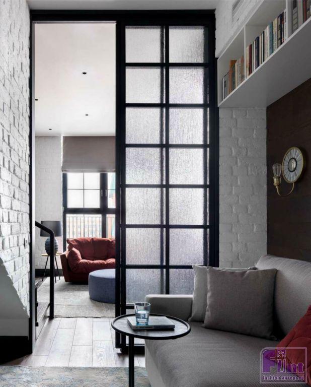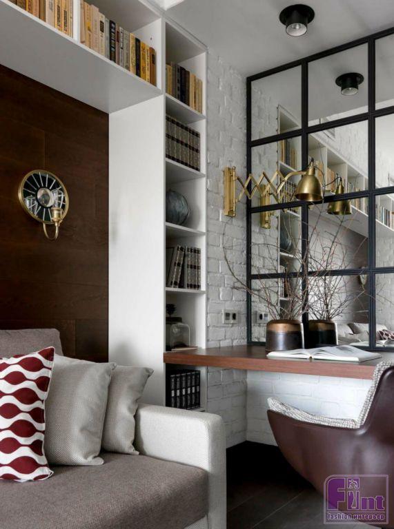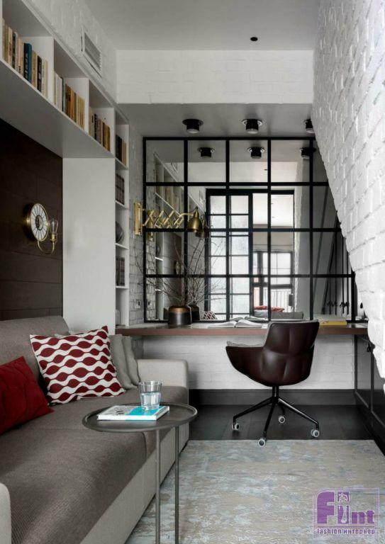 В кабинет ведут раздвижные двери, выполненные в виде перегородок с витражными стеклами и мелкой раскладкой. Стена за диваном обложена такой же паркетной доской, как и на полу. Короб, закрывающий балку, облицован кирпичом. Стена, к которой прикреплён навесной деревянный стол, выполнена зеркалом с квадратной раскладкой, как у витражных дверей. Пространство под лестницей использовано под встроенный шкаф.