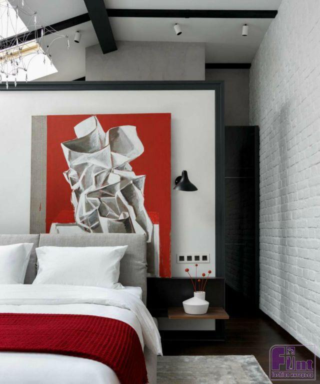 В спальную комнату ведёт скрытая дверь с зеркалом, над которой продолжается зеркальный потолок. В отделки помещения сочетаются два материала: белый крашеный кирпич и декоративная штукатурка. На стене за кроватью использована фреска с чёрно-белой иллюстрацией, обрамленная в чёрный багет. За ней расположен стеллаж с обувью. На одной из стен под потолком расположена скрытая секция-антресоль, дверь которой оштукатурена в цвет остальных секций.