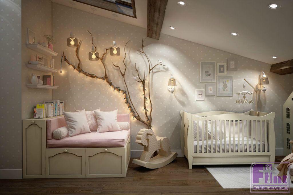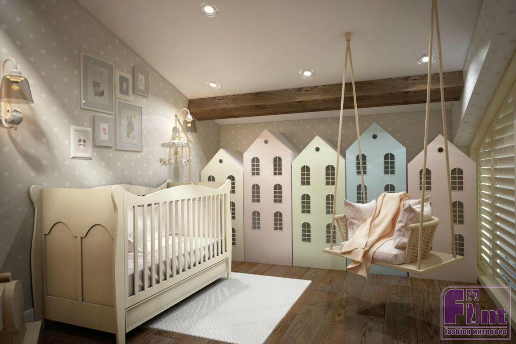 Со стороны детской с двойным мансардным окном балка обшита гипсокартоном. Подобраны разноцветные шкафчики-домики с вырезанными окошками. Нижняя часть стены выкрашена грифельной магнитной краской чёрного цвета. Её край, имитирующий крыши домов, обклеен белым полиуретановым молдингом. На стенах с помощью трафарета и краски создан стильный орнамент «горошек». В одной из частей детской установлен мягкий уголок, нижняя часть которого имитирует ящики на выступающем коробе лестницы, отделанной фальшпанелями. Украшает стену возле мягкого уголка дерево с огоньками. А также к потолку в комнате подвешены качели.