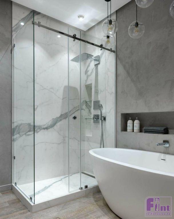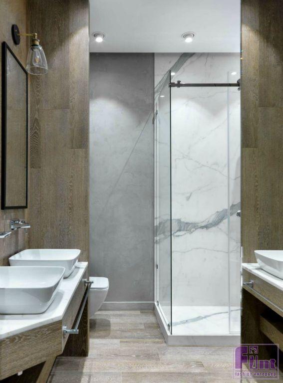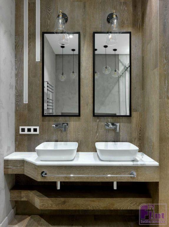 В ванной скомбинированы три материала с разным восприятием и ощущениями: мрамор - роскошь, дерево - уют, бетон-холод. Дно душевой выложено мозаикой-галькой на сетке тёмно-серого цвета с серой затиркой. Также для неё подобрана стеклянная перегородка. Ниша со стеклянными полочками под шампуни отделана штукатуркой. Столешница под умывальник выстроена из блоков и обложена деревянной плиткой под паркет, такой же, как и на полу. Над раковиной установлено зеркало в тёмной деревянной раме под цвет плитки.