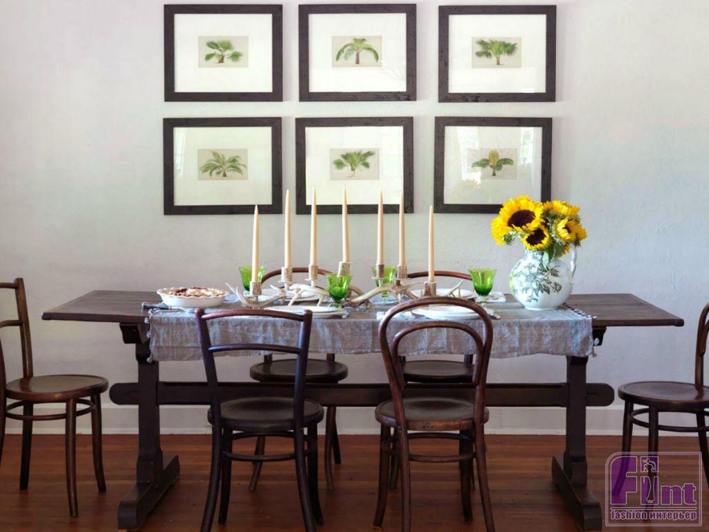 Самый популярный способ украсить стену над обеденным столом – это повесить над ним картины. Естественно, что содержание картин должно быть хорошо продумано. Чаще всего хозяева для этой зоны выбирают картины, на которых изображена еда или напитки. Также нужно обращать особое внимание на подбор багета. Он должен сочетаться с интерьером комнаты.