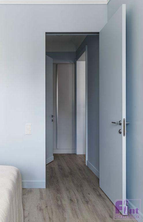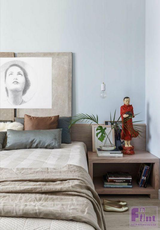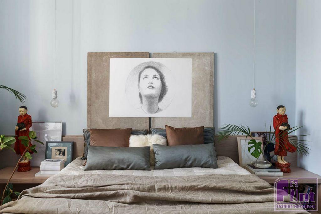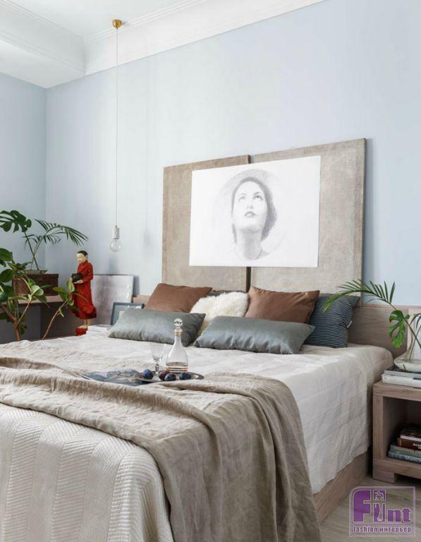 В квартире три окна, расположенные по одной стороне, так что дизайнерам пришла в голову мысль сдвинуть все второстепенные помещения (гардеробную, встроенные шкафы, ванную) вглубь квартиры, а жилые комнаты расположить ближе к свету. В спальне дизайнеры Прохор и Ольга предусмотрели рабочее место для занятий у окна. Вся мебель для спальни сделана на заказ по эскизам авторов проекта.