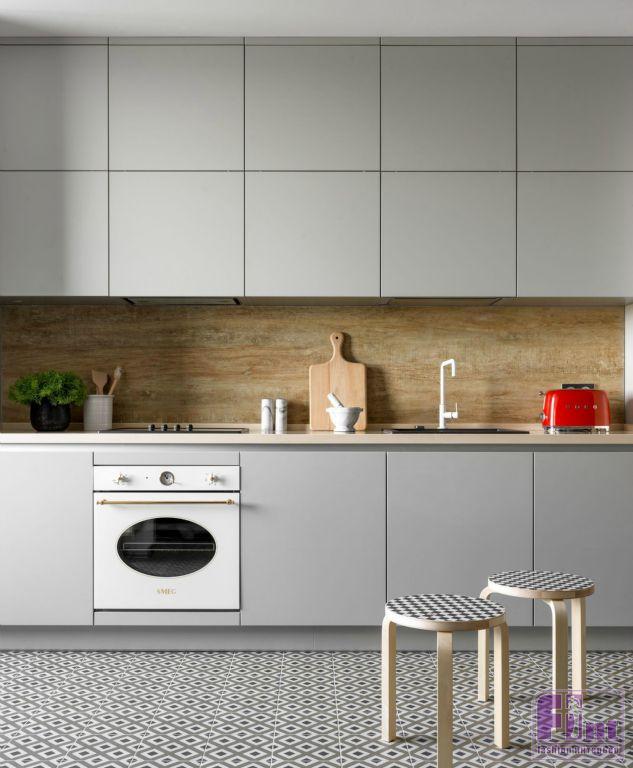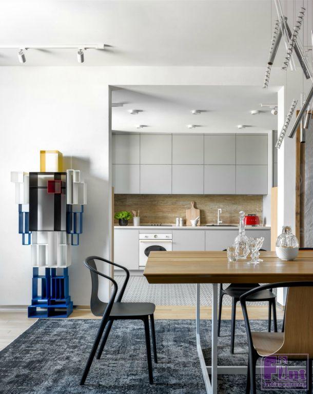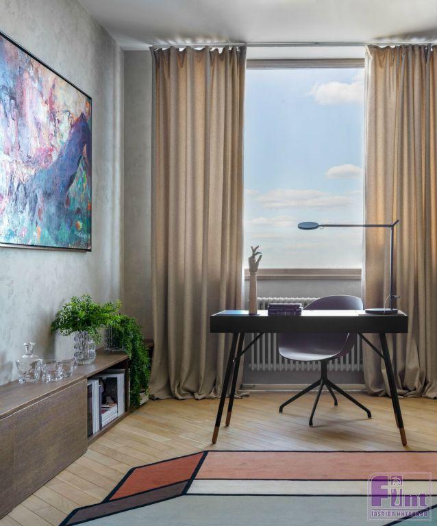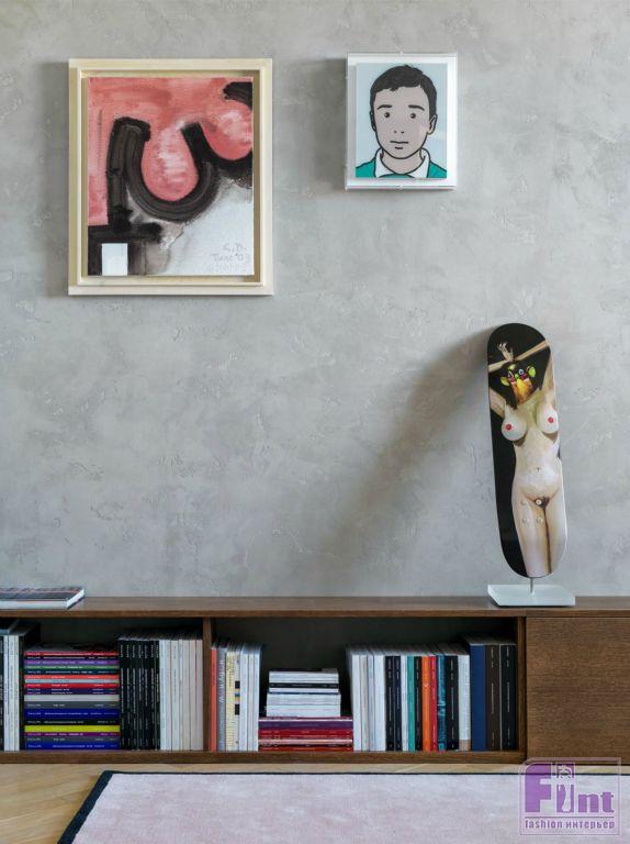 По задумке дизайнеров именно нейтральные оттенки стен как нельзя лучше позволяют акцентировать внимание на картинах. В коллекции Андрея можно найти работы и молодых художников, и признанных гениев, например, Энди Уорхола, Такаси Мураками, Эрвина Вурма. В квартире также есть небольшая мастерская для живописи. Разнообразие образцов современного искусства деликатно разбавляют стильные аксессуары, среди которых стоит выделить культовый ярко-красный бар-холодильник, выполненный в виде передней части знаменитого итальянского автомобиля FIAT 500.