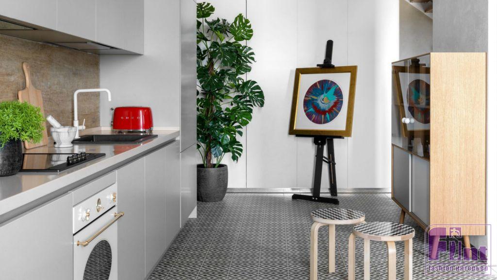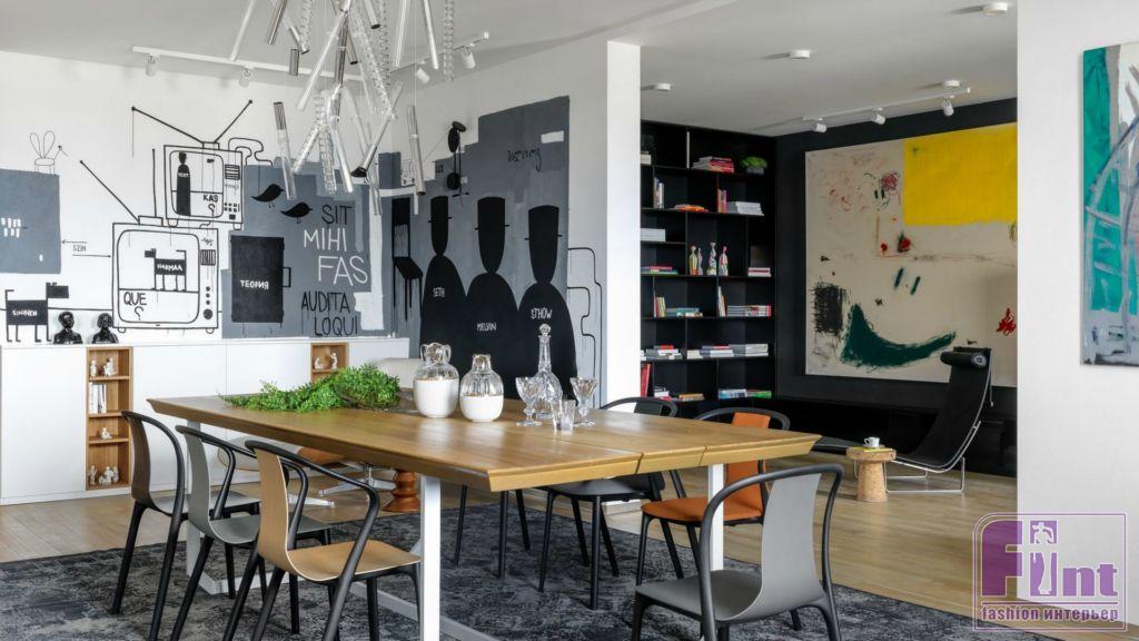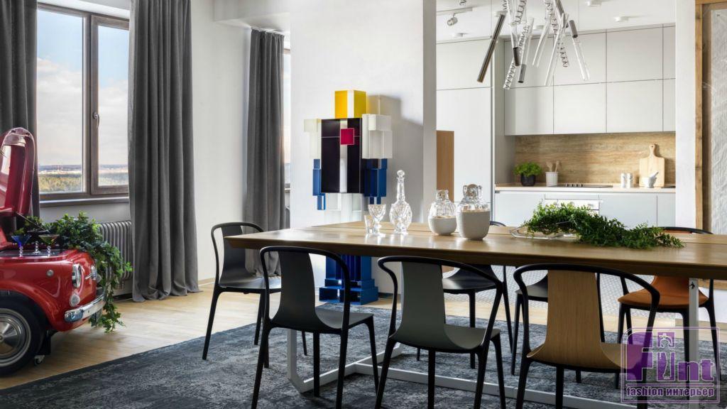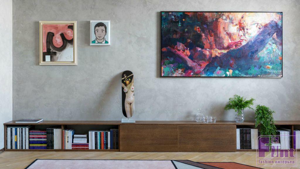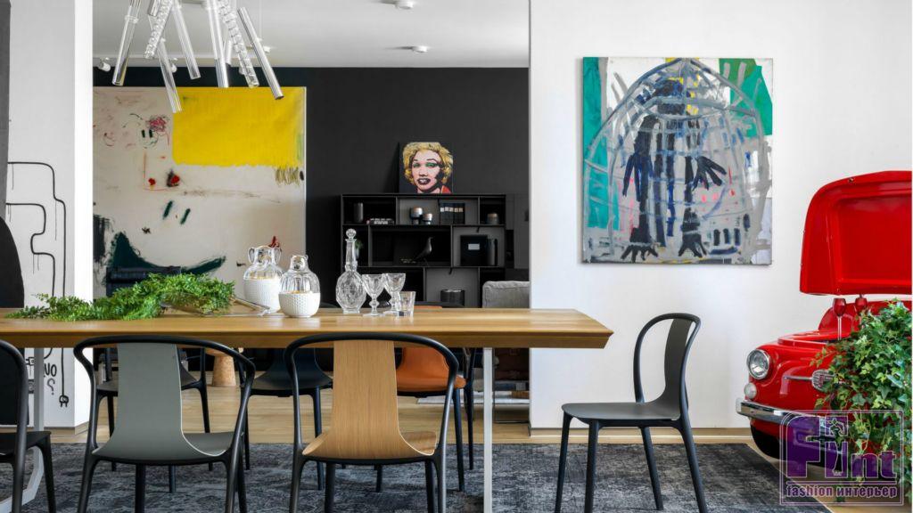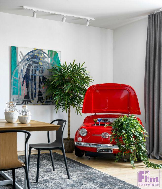 По задумке дизайнеров именно нейтральные оттенки стен как нельзя лучше позволяют акцентировать внимание на картинах. В коллекции Андрея можно найти работы и молодых художников, и признанных гениев, например, Энди Уорхола, Такаси Мураками, Эрвина Вурма. В квартире также есть небольшая мастерская для живописи. Разнообразие образцов современного искусства деликатно разбавляют стильные аксессуары, среди которых стоит выделить культовый ярко-красный бар-холодильник, выполненный в виде передней части знаменитого итальянского автомобиля FIAT 500.