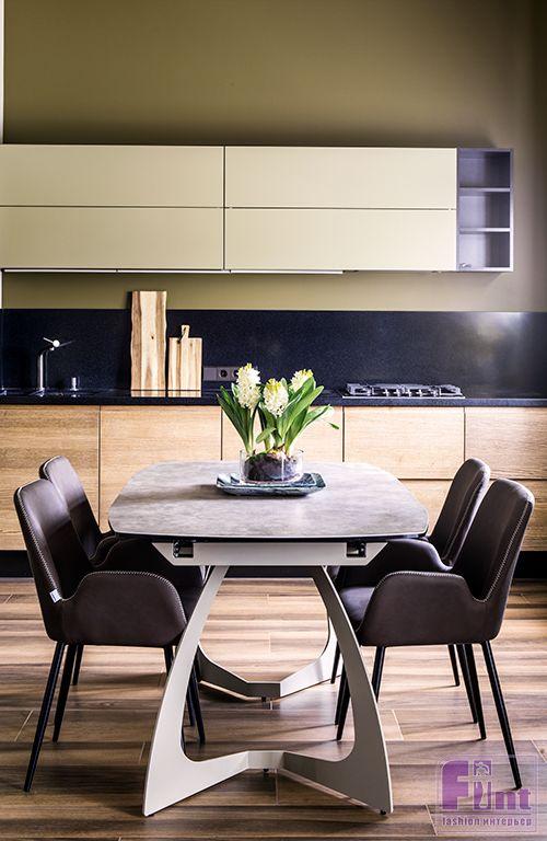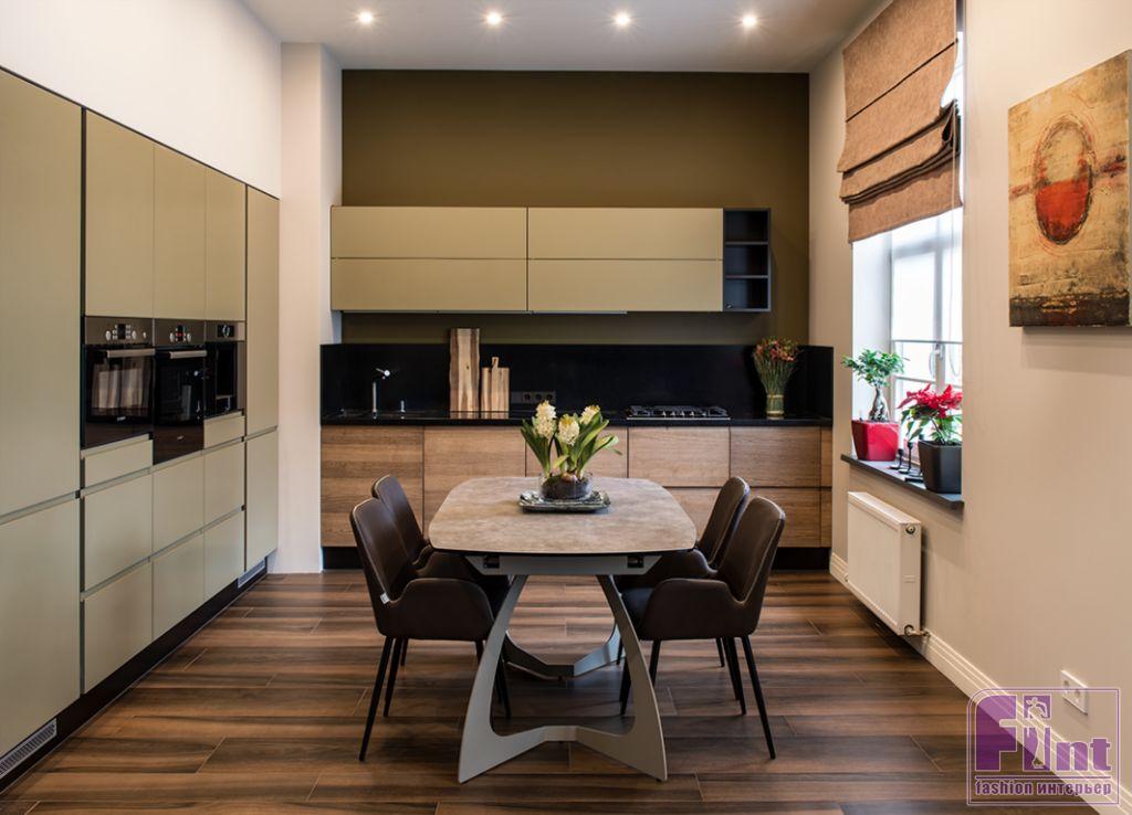 Кухня выполнена на заказ по чертежам дизайнера и состоит из полностью закрытых шкафов и тумб с двухцветными фасадами: верхняя часть навесных шкафов и встроенный массив кухни с холодильником, духовыми шкафами и микроволновой печью окрашены в тёплый пастельный оттенок кремового. Фасады нижних шкафов отделаны под дерево и накрыты стильноё тёмной столешницей.