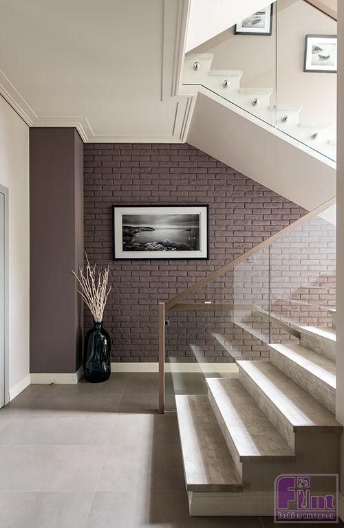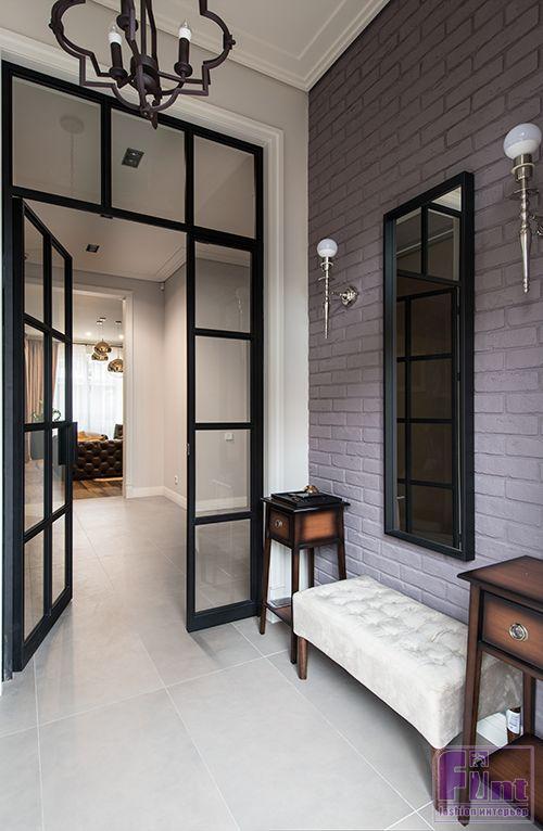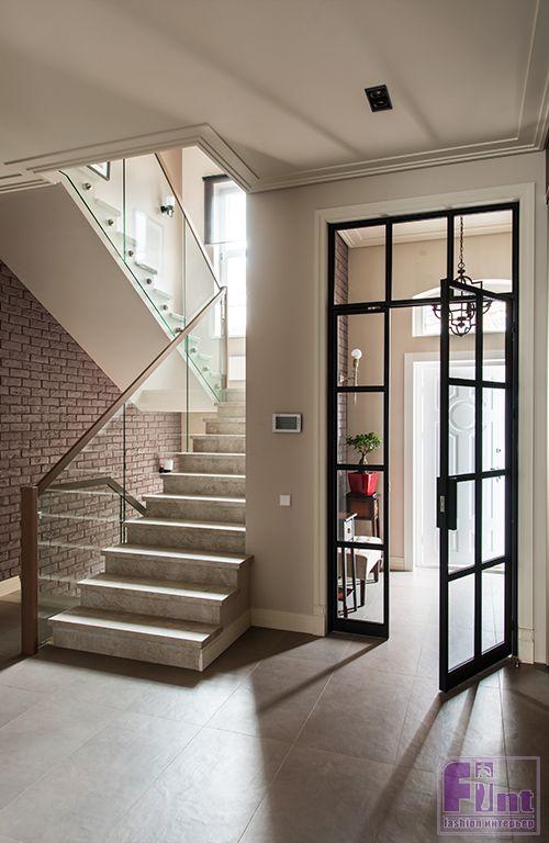 Индустриальный лофт встречает гостей непосредственно с прихожей и всей входной зоны, включающей лестничный холл первого этажа. Стеклянный тамбур в тёмной геометрической раскладкой, идеально тонированный кирпич на стенах холла и лестничных пролетов прекрасно задаёт правильный тон в восприятии интерьера.