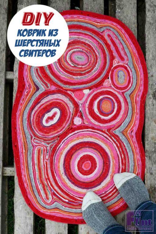 Наш сегодняшний мастер-класс покажет, как из старых, поношенных и пришедших в негодность трикотажных свитеров сделать потрясающий по красоте и мягкости коврик для создания в вашем интерьере стильного и яркого акцента. Благодаря исходному материалу – шерстяному трикотажу – коврик получается очень приятным на ощупь, и по нему невероятно комфортно ходить босиком.