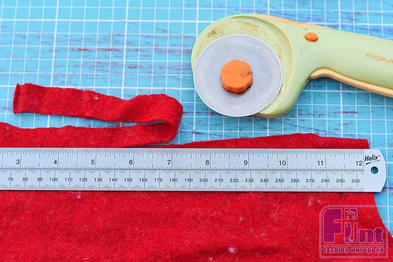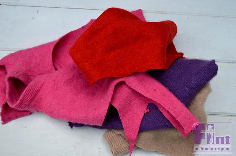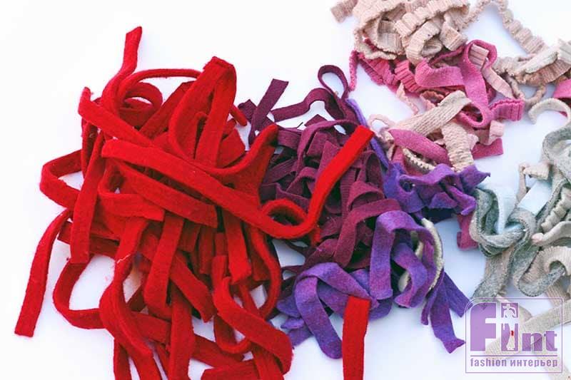 Первое, что нам необходимо сделать – это отобрать старые свитера, которые подойдут для нашего мастер-класса. Желательно, чтобы свитера имели сочетаемую между собой расцветку. Выбрав свитера, закиньте их в стиральную машинку и постирайте в горячей воде. После высыхания, начните «распускать» свитера на узкие, равные по ширине, полоски, используя металлическую линейку в качестве направляющей, и резак с круглым вращающимся лезвием. Убедитесь, что все работы вы проводите на специальном коврике для резки, чтобы не повредить поверхность стола или пола. Если вы не найдёте достаточное количество свитеров, вы можете дополнить свой коврик обрезками войлока.