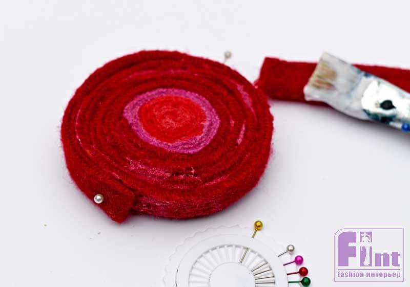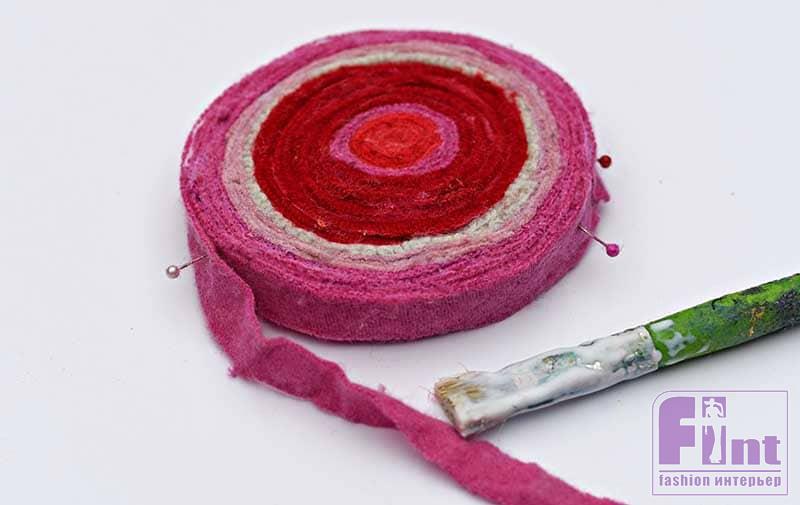 Приступаем к скручиванию заготовок для коврика! Возьмите полоску первого выбранного цвета, промажьте одну её сторону клеем для ткани и сверните её в тугую спираль. Затем возьмите следующую полоску другого цвета, покройте одну сторону тканевым клеем и оберните эту полоску вокруг первой трикотажной спирали. Чтобы концы полосок оставались на месте, закрепите их обычными английскими или портняжными булавками.