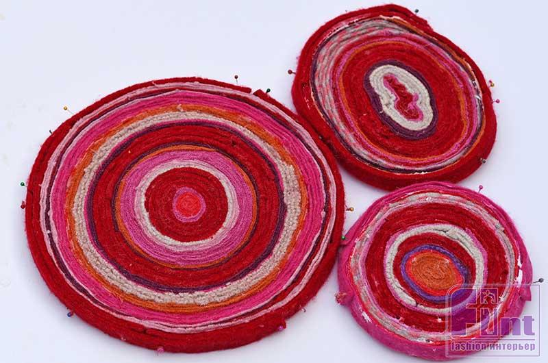 Продолжайте добавлять разноцветные полоски к спирали, и она будет медленно становиться все больше и больше. Для этого узора нет установленного рисунка или порядка цветов, в котором следовало бы добавить войлочные полоски. Нам показалось, что наш коврик будет выглядеть прекрасно, если создать спирали разного размера из пёстрых и разноцветных полосок, подобранных случайным образом. Хотя некоторые цветовые переходы мы старались сохранять на спиралях разных размеров. В любом случае, выбор цветовых сочетаний и размеров спиралей – за вами.