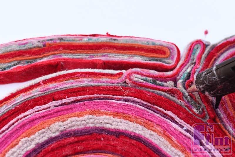 Соединив получившиеся спиральные заготовки вместе, вы обнаружите, что между ними возникли промежутки. Чтобы их красиво заполнить, просто сделайте ещё несколько маленьких спиралей, которые будут плотно входить в образовавшиеся пространства между округлыми формами заготовок. Не переживайте, если некоторые такие «заполнители пространства» будут довольно странной формы, далёкой от округлых форм заготовок. Заполните все промежутки, используя горячий клеевой пистолет. После того, как вы соберёте свой коврик, начните приклеивать трикотажные или фетровые полоски по внешнему периметру коврика. Эти полоски, выполняющие роль своеобразной обвязки, помогут «собрать» коврик в один красивый аксессуар.