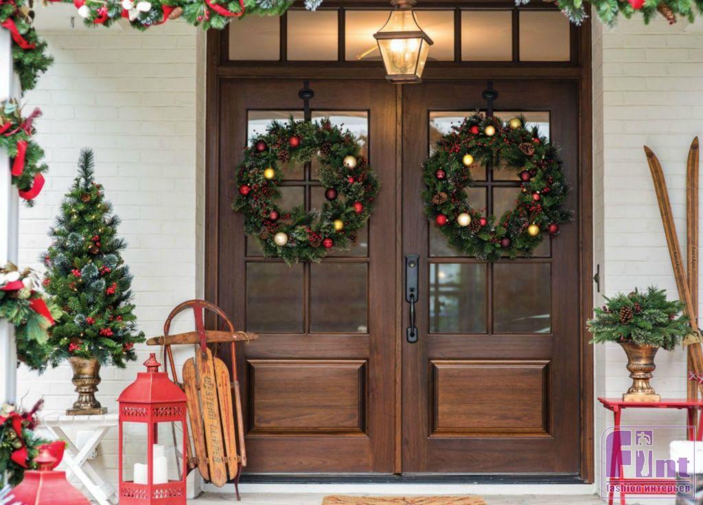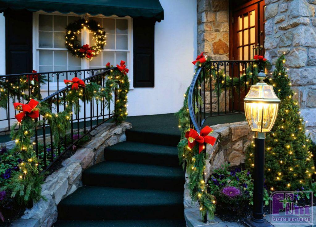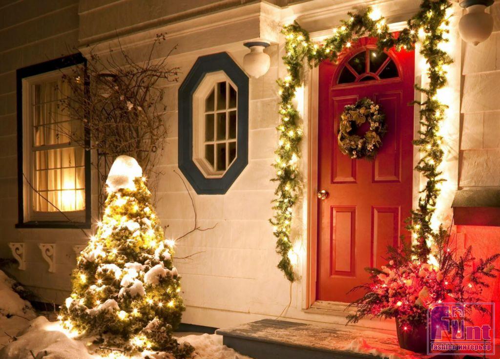 Пусть праздник встречает ваших гостей прямо на входе в жильё. Если у вас частный дом, то разгуляться вообще есть где. Обязательны гирлянды, которые можно расположить на фасаде дома, калитке или растущих на участке деревьях. Выбирайте специальные модели электрических гирлянд для улицы, они не подвержены холодам, влагостойкие и не выйдут из строя, если пойдет снег.