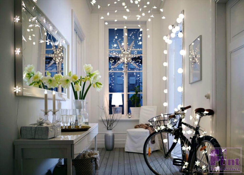 Итак, дверь открывается, и гости попадают в вашу прихожую. Она, безусловно, требует украшения, но здесь дизайнеры по интерьеру советуют быть всё-таки сдержаннее, и не обрушивать на только что оказавшегося в квартире человека всю новогоднюю красоту сразу. Сосредоточимся на акцентах. Если в прихожей шкаф с зеркальными дверками, их можно оформить светящимися в темноте наклейками. Ещё вариант – повесить на стену новогоднее панно. Этого, ну и, возможно, небольшой вазы с хвоей и ягодами рябины, если есть куда её поставить, будет, в общем-то, и достаточно для Нового года 2021.