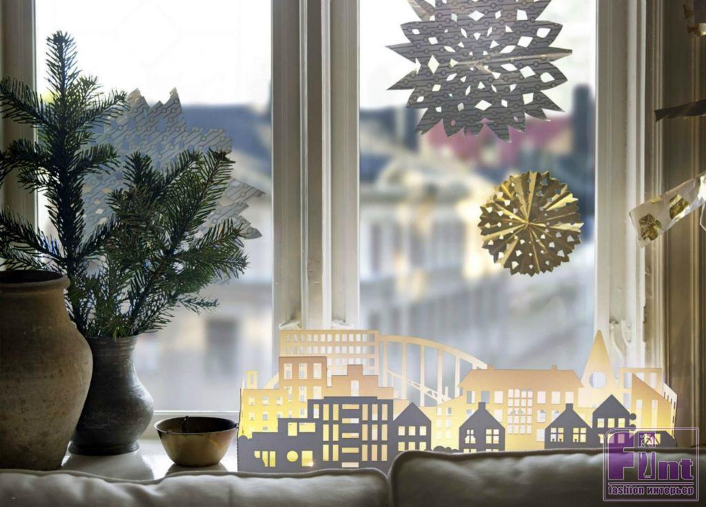 На окна делаем снежинки - помните, как в советском детстве своими руками вырезали их из бумаги? Самое время освежить навык, только теперь вместо бумаги можно использовать яркую упаковочную плёнку. Хотите сэкономить время - сделайте один трафарет, приложите к окну и закрасьте отверстия в нем специальной краской или разведённой в воде зубной пастой. Получится стильный размытый контур, совсем как морозные узоры. Плюс, всегда можно купить готовые наклейки на окно. Не забудьте и про подоконник. На нём раскладываем те же хвойные ветки с бантами из шифона или фольги, ставим корзинки с шариками, шишками и мандаринами. Хорошо будет смотреться и новогодняя «штора» из цветных лент или светодиодных лампочек разной формы.