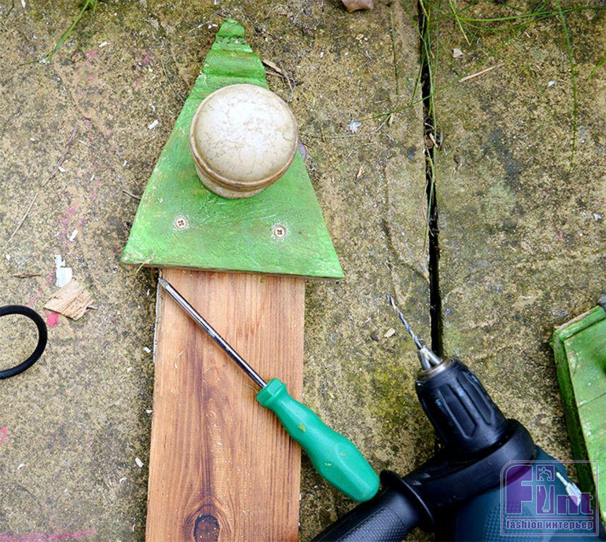 На следующем этапе мы будем подготавливать ручки, крючки и другие скобяные изделия, заготовленные заранее. Соскоблите излишки ржавчины с металлических предметов и окрасьте деревянные изделия, используя аэрозольные краски ярких оттенков. Покрасить ручки и крючки также можно вручную обычными акриловыми красками.