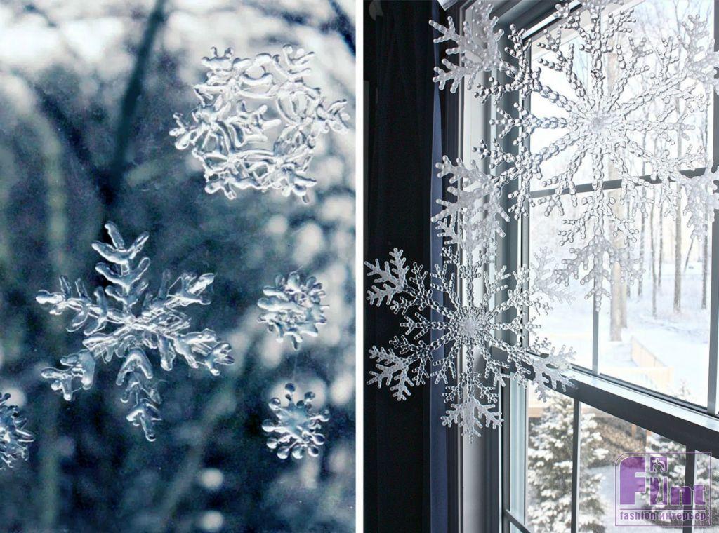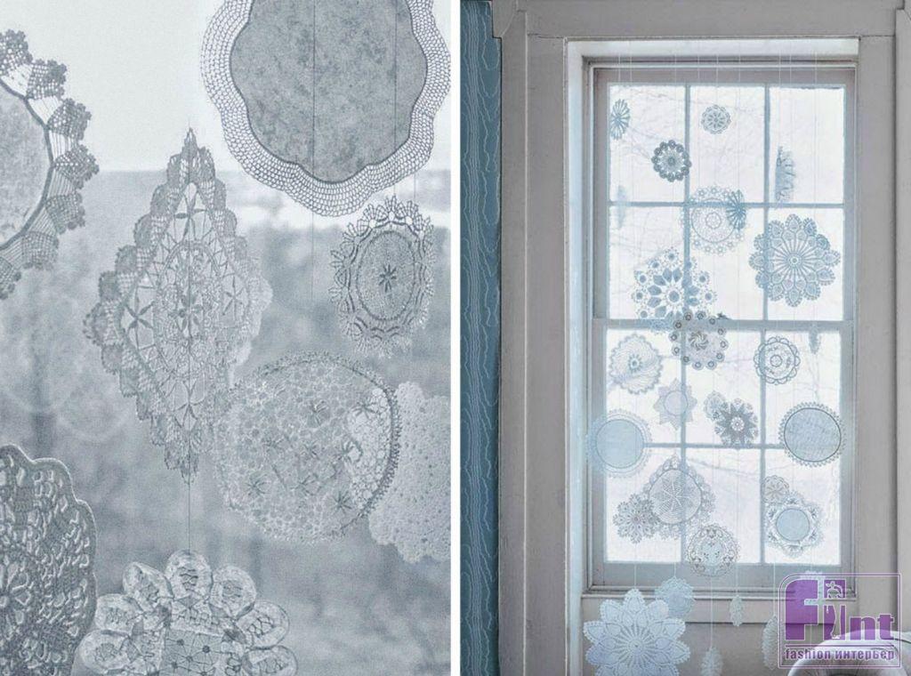 Вариант с украшением окна бумажными снежинками известен всем, а посмотрите, как красиво и необычно смотрятся в этом качестве вязаные салфетки! Может быть, у вас остались такие, связанные вашей бабушкой, или вы вяжете их сами, или найдёте на блошином рынке. Чтобы снежинки держали форму, пропитайте их сахарным раствором или хорошо накрахмальте и высушите на ровной поверхности. Крепить снежинки лучше всего на прозрачный двусторонний скотч, который потом можно без следа удалить со стекла.
