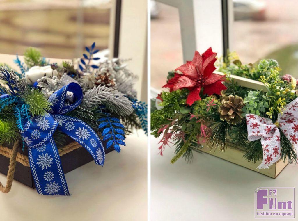 Потребуются деревянные ящики и веточки живой хвои с шишками. В ящики можно поместить влажный песок и воткнуть в него ветки хвои, чтобы вода поддерживала их свежими. Соберите композицию, которая вам нравится, можно добавить игрушки или мишуру. Такие ящики с новогодней композицией можно также украсить небольшой электрической гирляндой на батарейке.