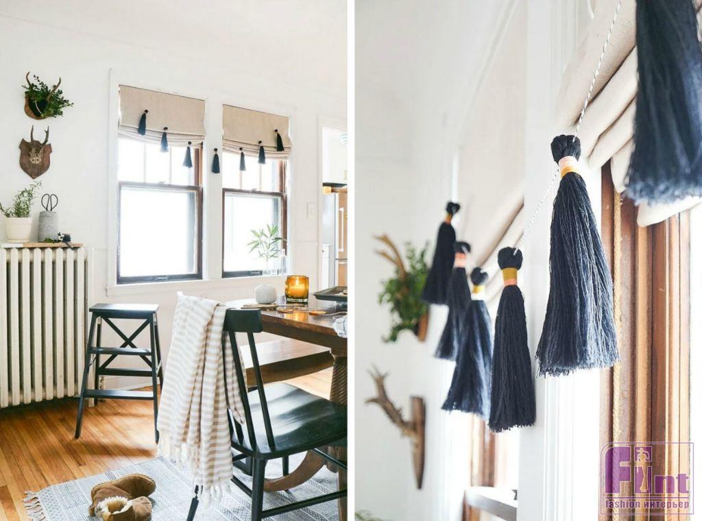 Просто, красиво и изысканно — гирлянда из кисточек. Сделайте кисточки из ниток и нанижите их на шнурок. Кисточки могут быть как однотонные, так и разноцветные. Для новогоднего декора отлично подходят кисти в классических новогодних цветах: белый, синий и красный. Для крепления кистей на окно можно использовать ёлочные гирлянды, которые придадут подвеске дополнительный шарм.