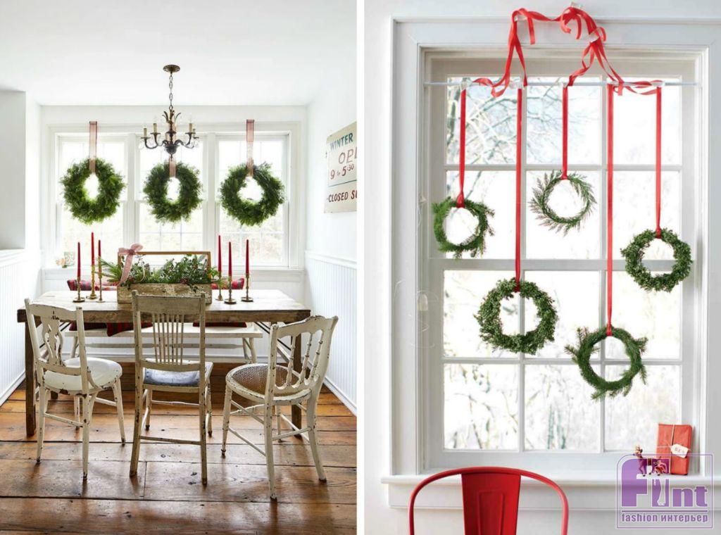 Повесьте рождественские венки не на стену или дверь, а на окно, подобрав красивые ленты. А ещё можно лентами соединить несколько венков в красивые гирлянды. Способ украшения окон рождественскими венками универсален и подойдёт под окна любых размеров и форм, поскольку сами венки сейчас можно найти или сделать своими руками в самых различных размерах и дизайне.