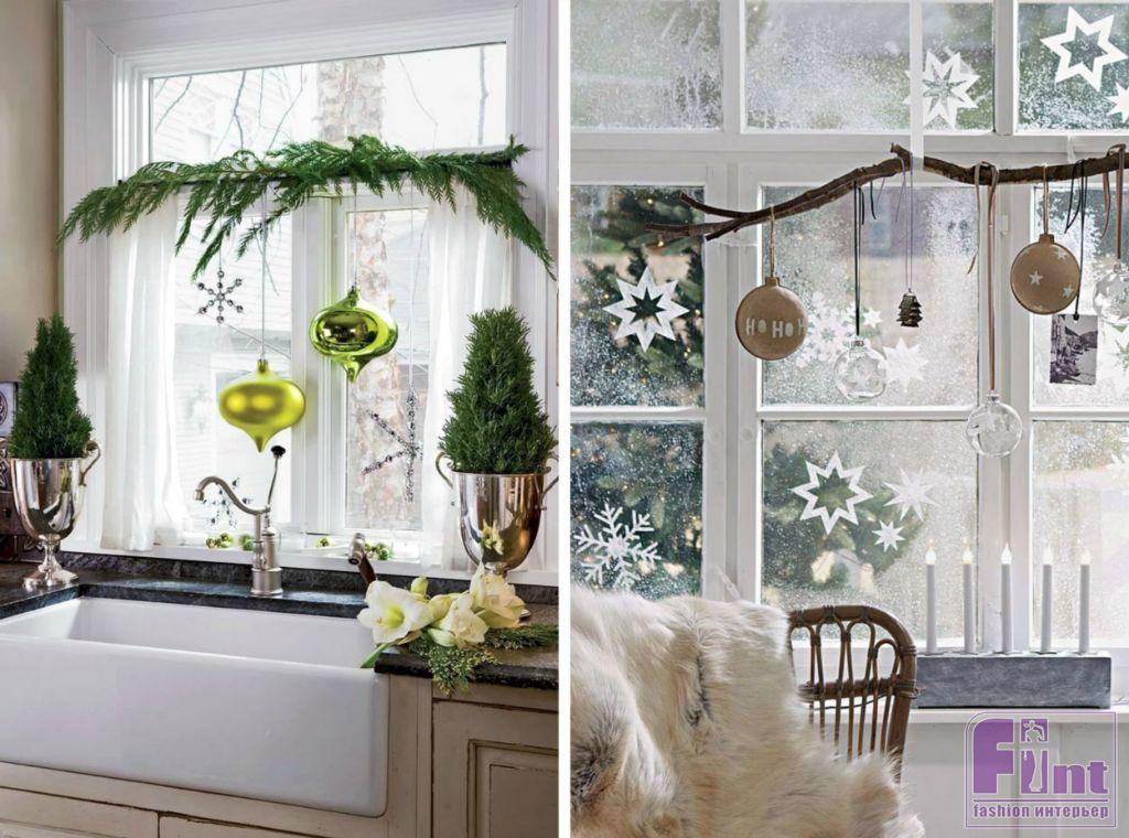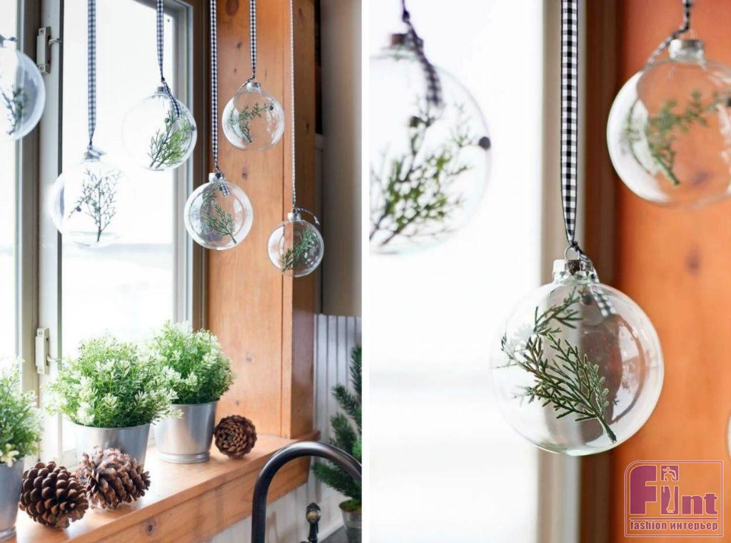 Для такого декора подойдут пластиковые или стеклянные шарики — главное, чтобы они были прозрачными. Также потребуются маленькие веточки хвои и красивая лента. Просто снимите заглушки с шариков, поместите внутрь веточки, верните заглушки на место и повесьте шарики на ленту на окно на разном уровне. В продаже можно найти готовые украшения аналогичного вида, но гораздо интереснее сделать их своими руками!