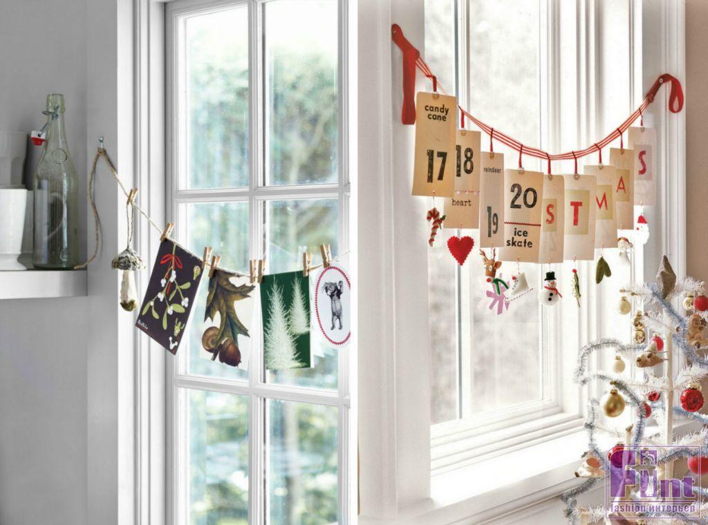 Протяните верёвку поперёк окна и развесьте на ней красивые новогодние открытки. Прекрасно смотрятся старые винтажные открытки, которые можно найти в интернете и распечатать на плотной бумаге. Вместо открыток можно использовать натянутую бечёвку для развешивания «листков» импровизированного календаря на декабрь. Изображения для такого календаря также без труда можно найти в интернете.