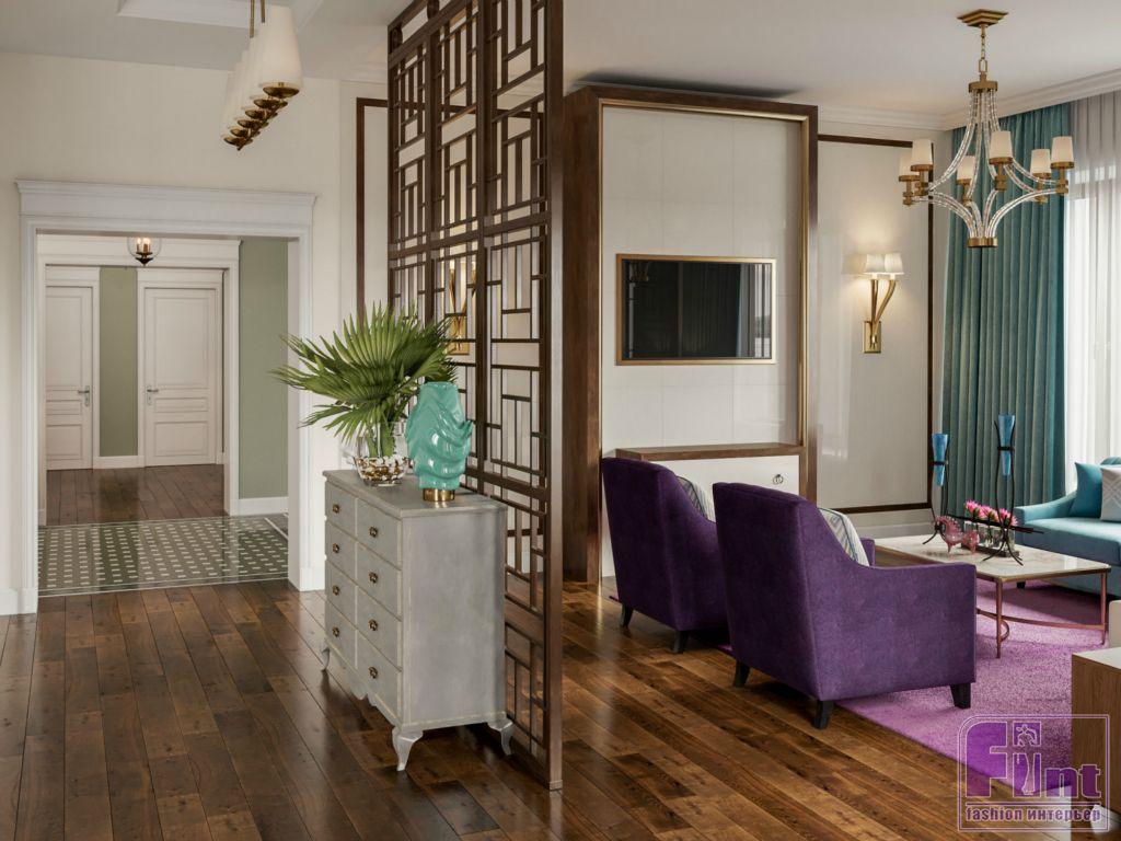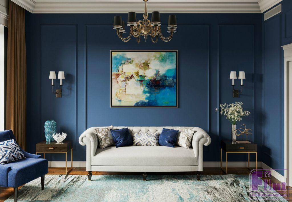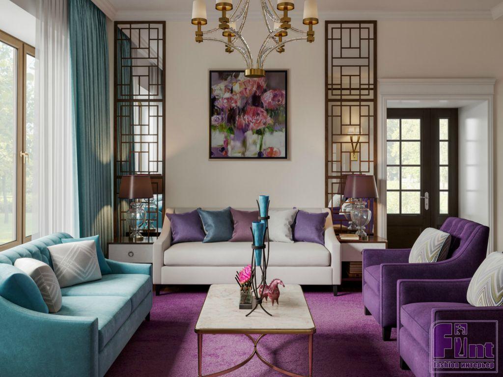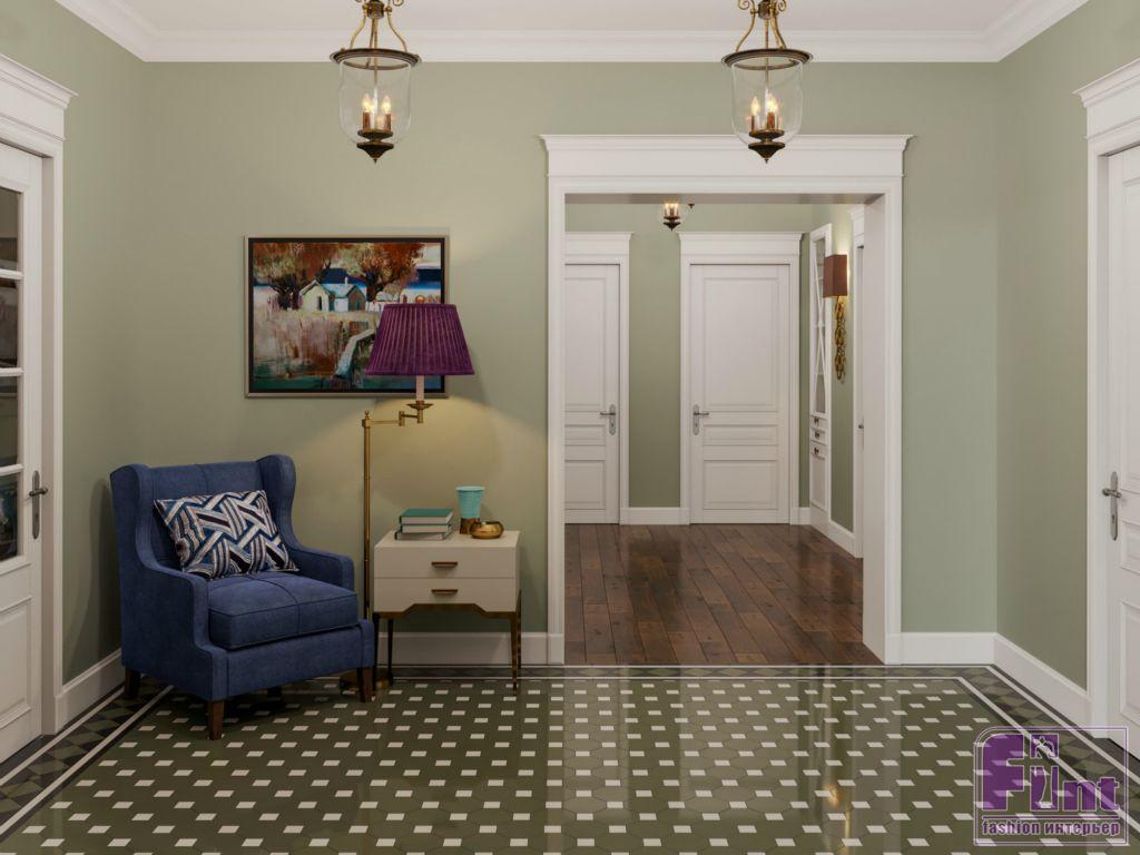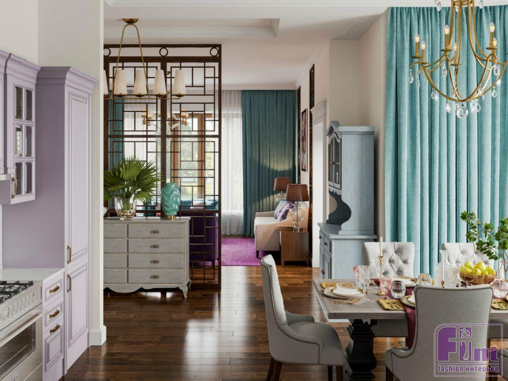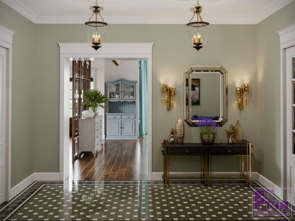 Интерьер дома, выполненный в стиле английской классики, получился изящным и свежим за счёт разнопланового цветового решения. Цвет каждой комнаты тщательно согласовывался с заказчиками. Многие оттенки пришли в проект из палитры старинных английских особняков. Кабинет оформили в глубокий синий цвет (navy blue), а гостиную сделали нейтральной, но подобрали для неё яркие интерьерные акценты. Все стены в доме выкрашены экологически чистой краской английского производства. Столовую от гостиной отделяет красивая резная панель, деликатно зонирующая помещение.