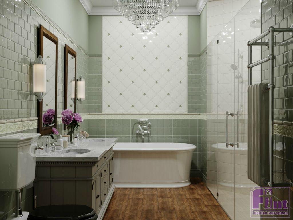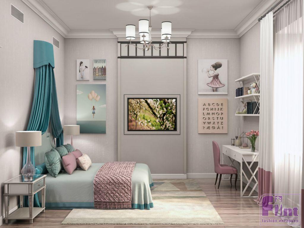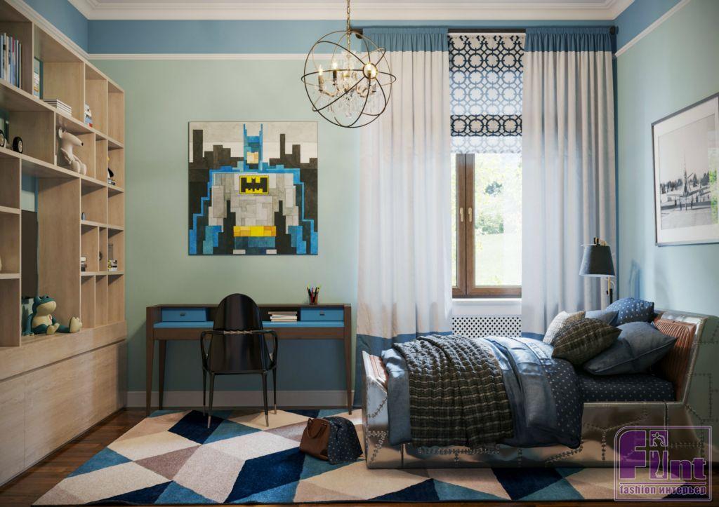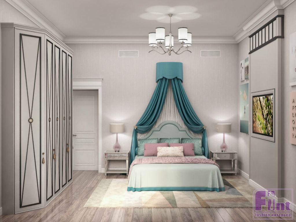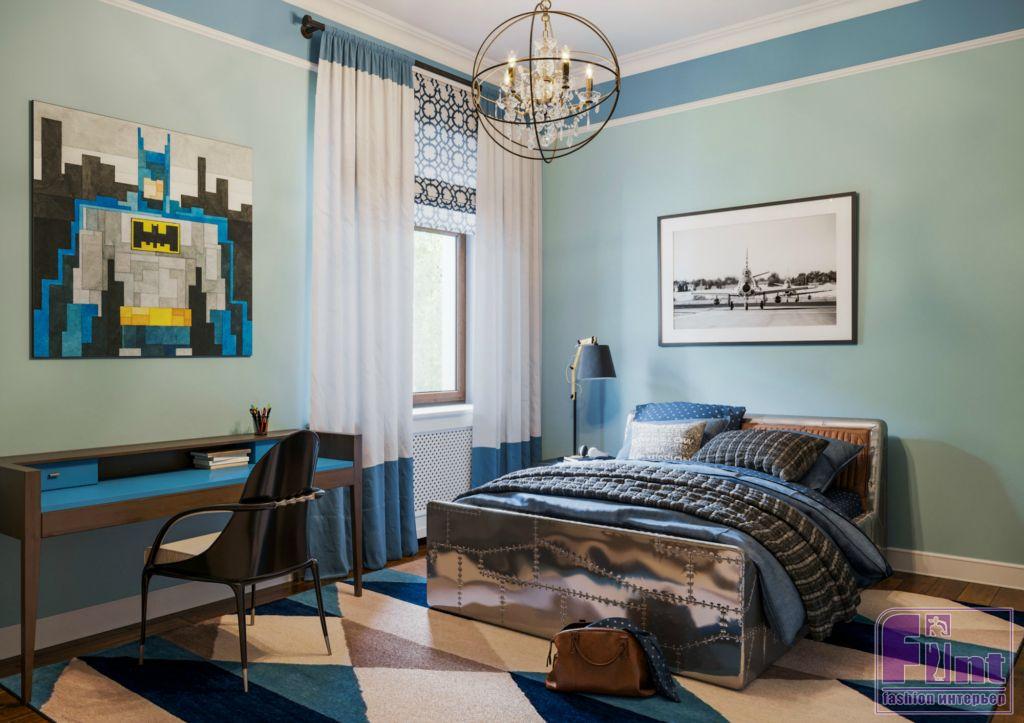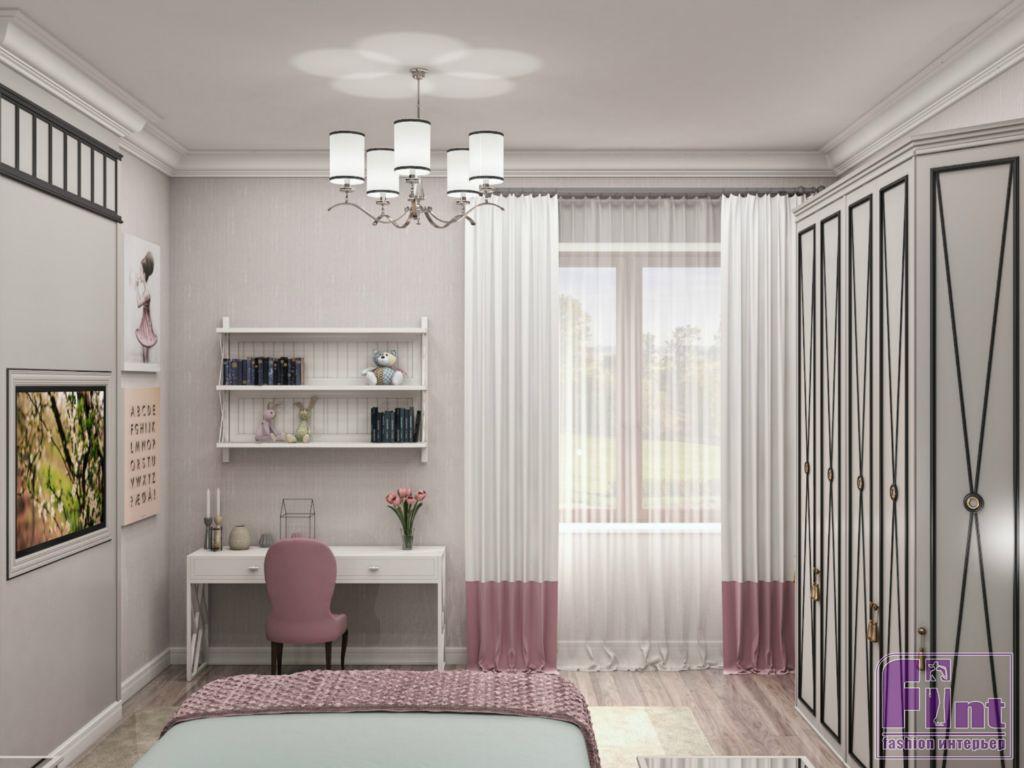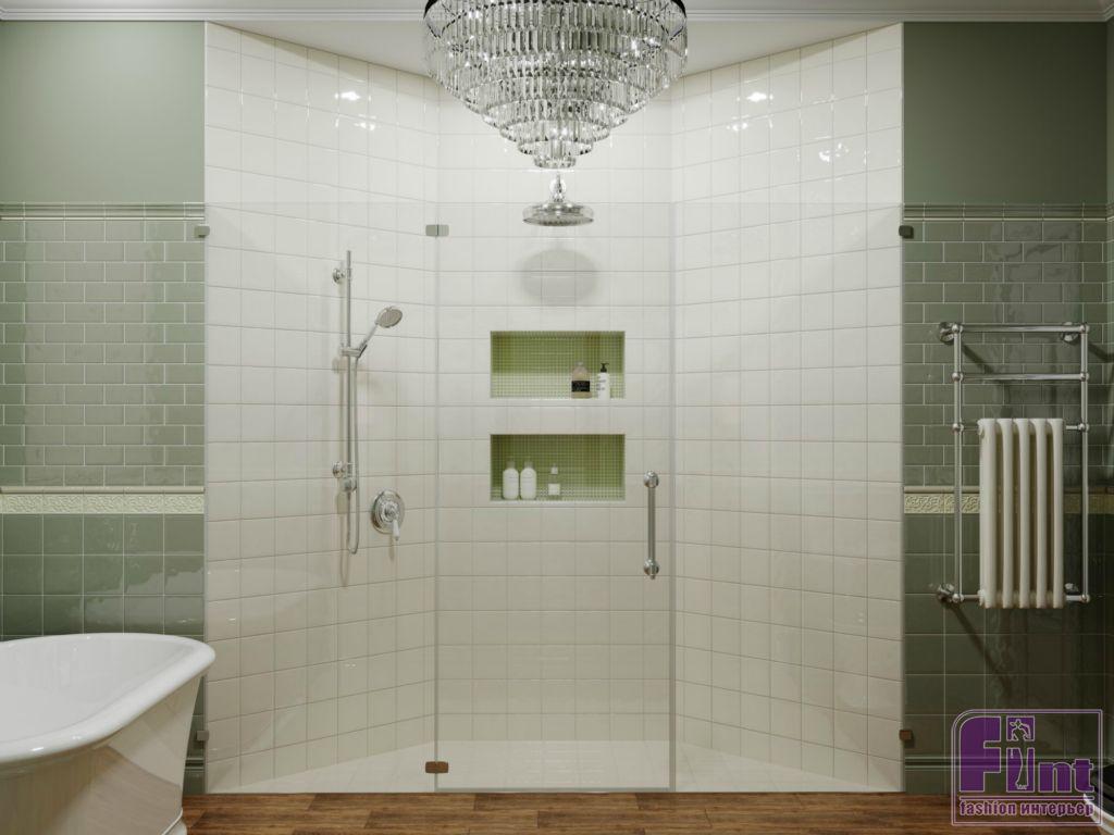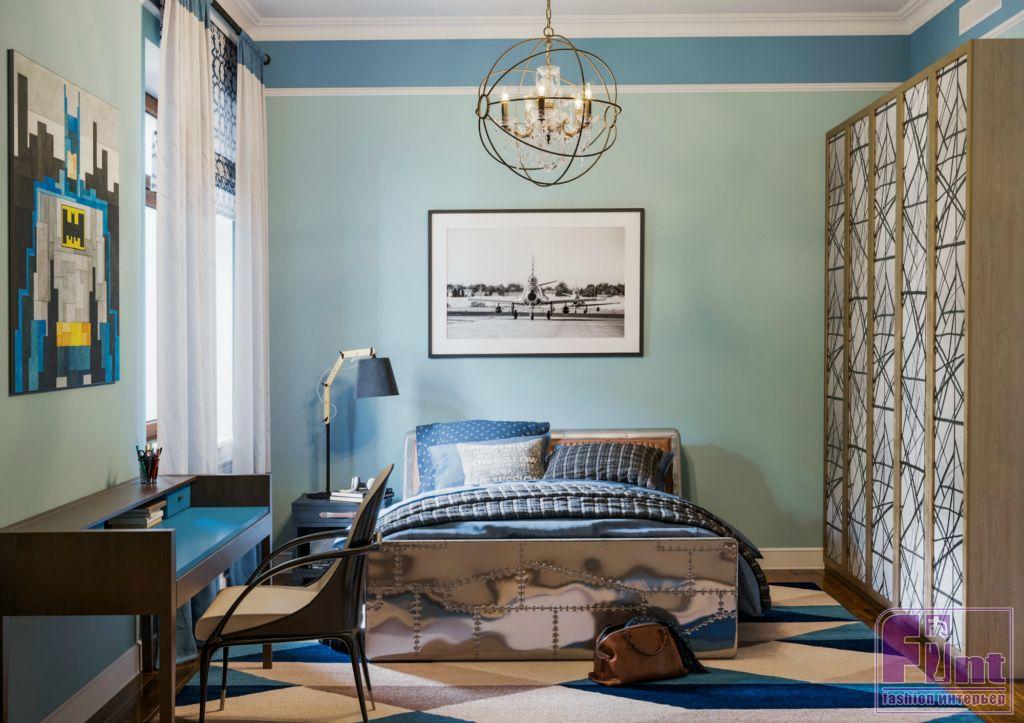 Детская комната для девочки оформлена в приятных пудровых оттенках. Яркий акцент – небольшой балдахин над кроватью, выполненный в глубоком бирюзовом цвете, прекрасно сочетающимся с общим нежно-розовым оттенком стен, белым потолком и нейтральным паркетом. В детской комнате для сына классический стиль приобрел немного «хулиганский» мужской характер Часть ванной при спальне хозяев выделена под просторную душевую кабину.