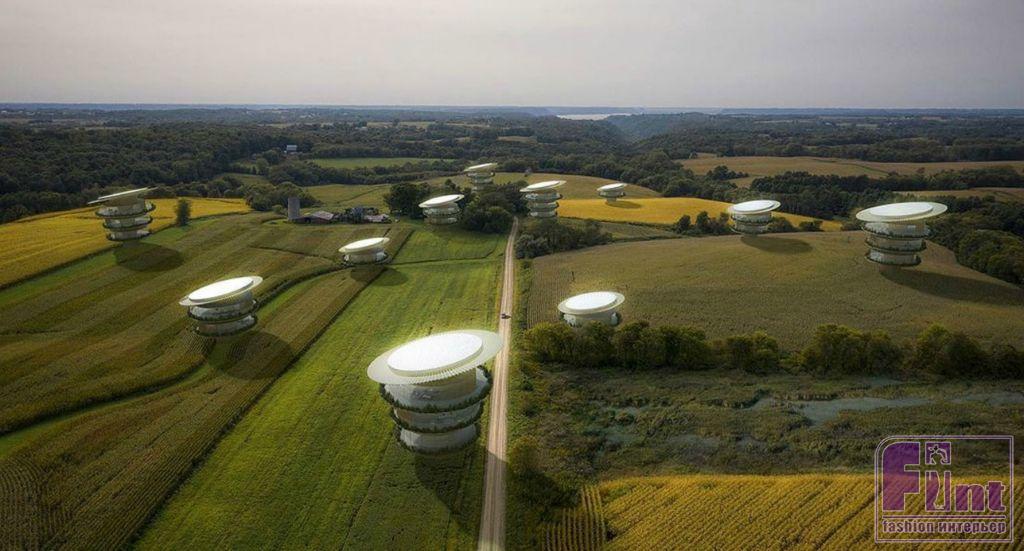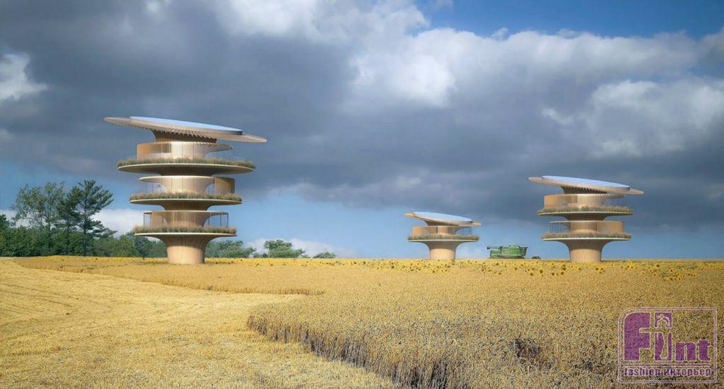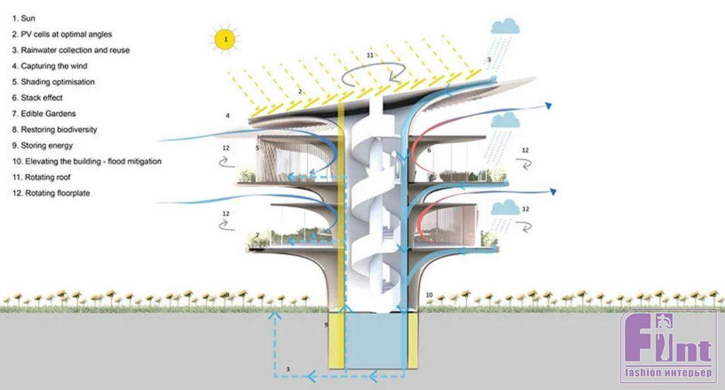Неиспользованная энергия может подаваться в сеть или храниться в «семенах»-батареях, а дождевая вода собирается и используется для орошения, и в сантехнических системах. На каждом этаже дома находится квартира с двумя или тремя спальнями, а каждое здание может масштабироваться вверх.