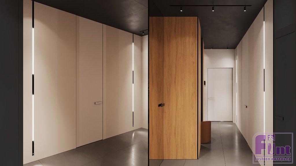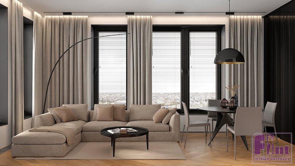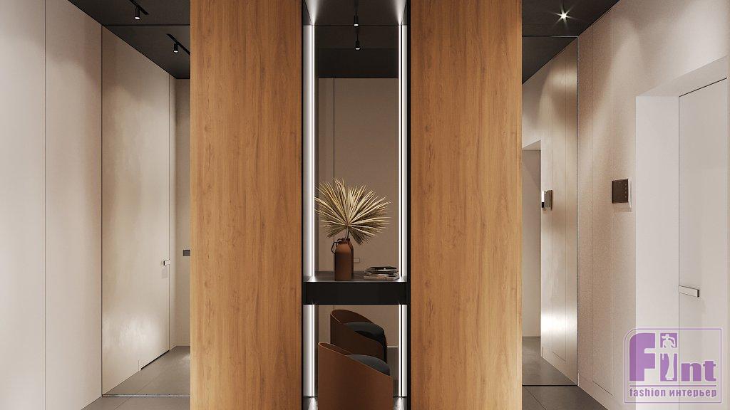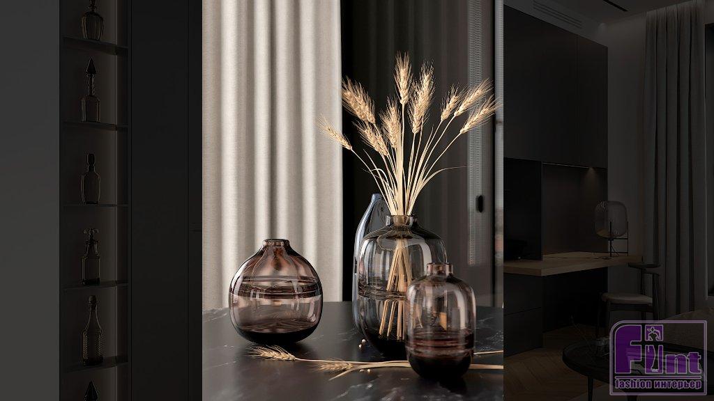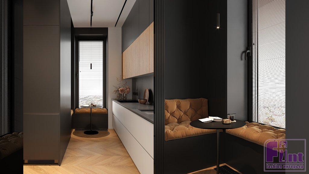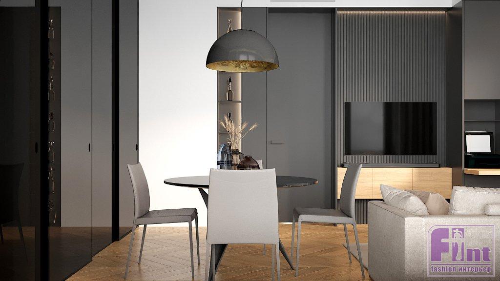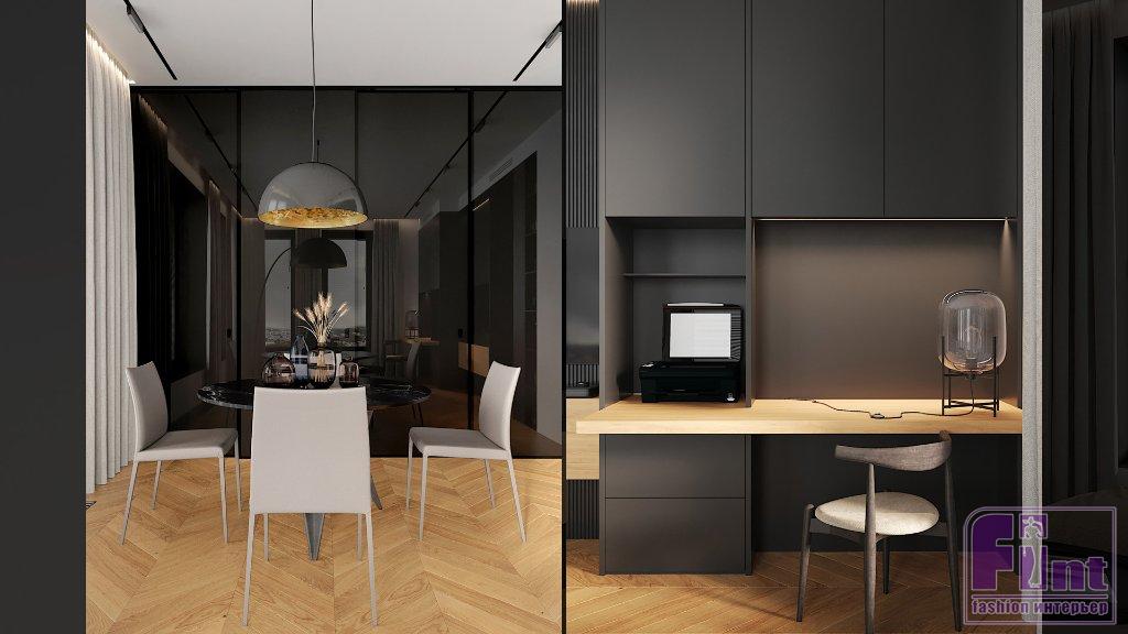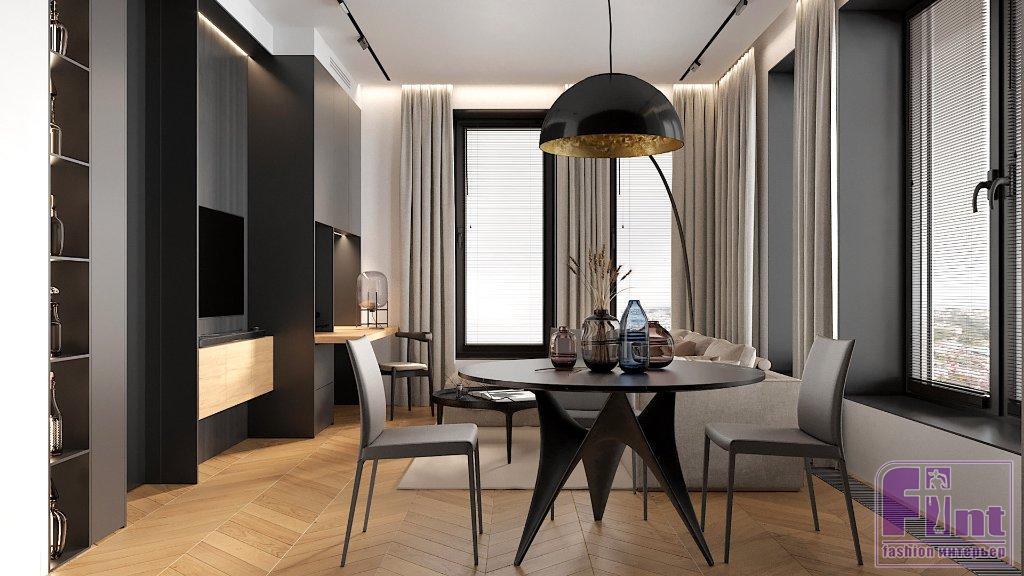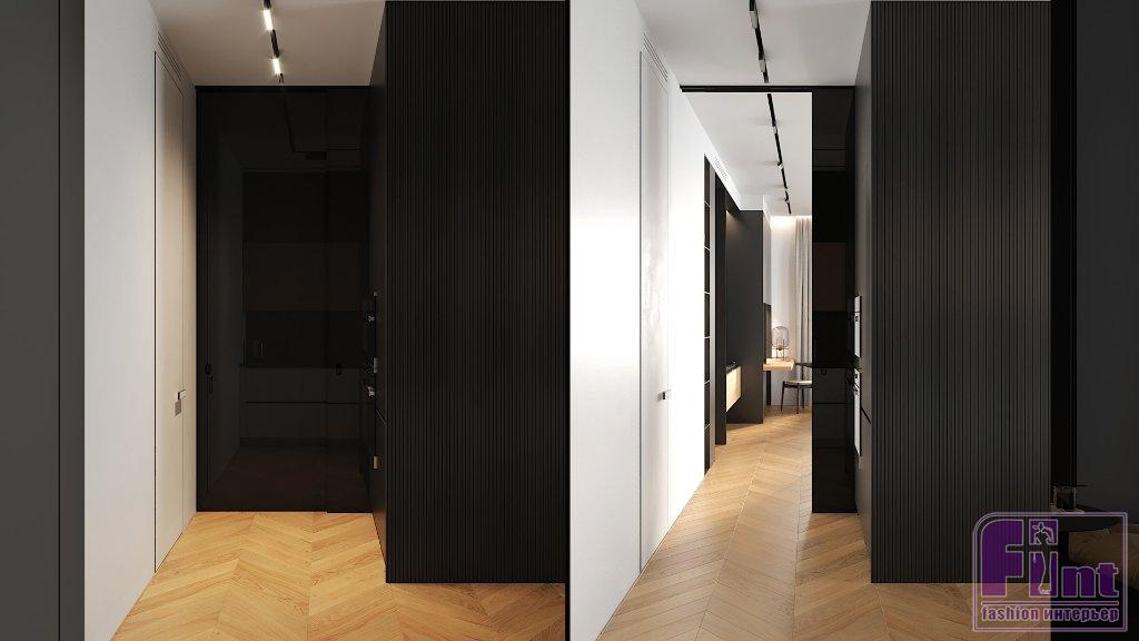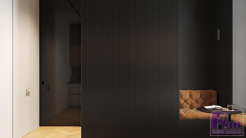 Заказчики этого проекта постоянно проживают в Европе, но часто бывают по делам, связанным с бизнесом, в Москве. Устав от отелей, они решили приобрести здесь небольшую квартиру — для себя и для гостей, которых планировали принимать. Интерьер решён на контрасте светлых стен и практически чёрных стеновых панелей. Желая избежать перепланировки и при этом добиться большей функциональности, автор проекта Михаил Новинский разделил кухню и гостиную раздвижными перегородками, организовав два входа. Такое решение позволяет хозяевам пользоваться кухней, даже когда в соседней комнате отдыхают гости.