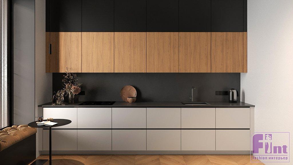 Кухня оформлена подчеркнуто минималистично, как и вся квартира. Строгий светлый монохром нижних шкафов кухонного гарнитура прекрасно сочетается с цветом натурального дерева, использованным в фасадах навесных шкафов. Цвет навесных шкафов отлично сочетается с уложенным на пол паркетом светлого естественного оттенка дерева. На кухне нашлось место и для мягкого уголка. В небольшой зоне с кофейным столиком и диванными подушками можно позавтракать, не беспокоя гостей. Роль одного из мягких диванов в этой зоне исполняет широкий подоконник под большим панорамным окном.