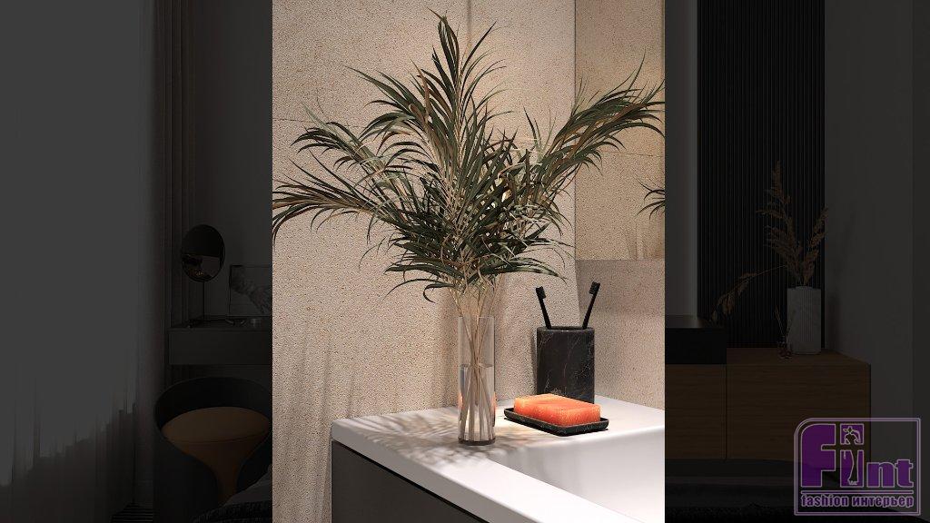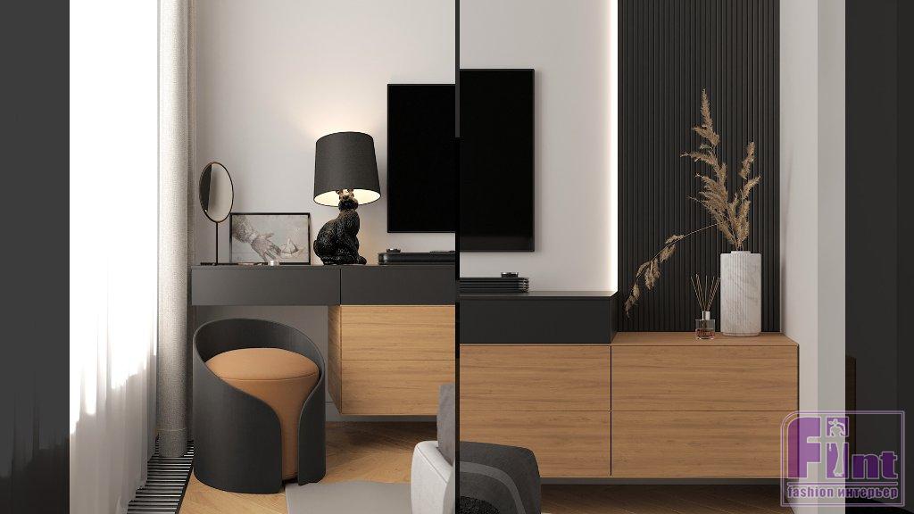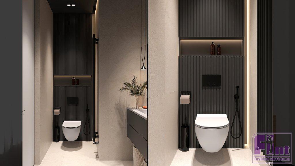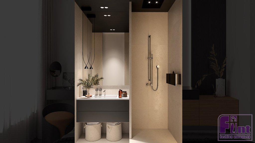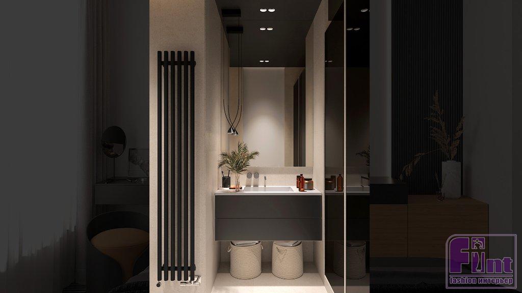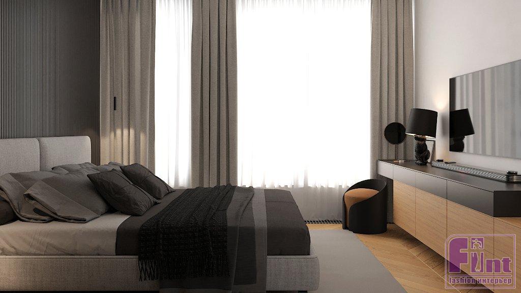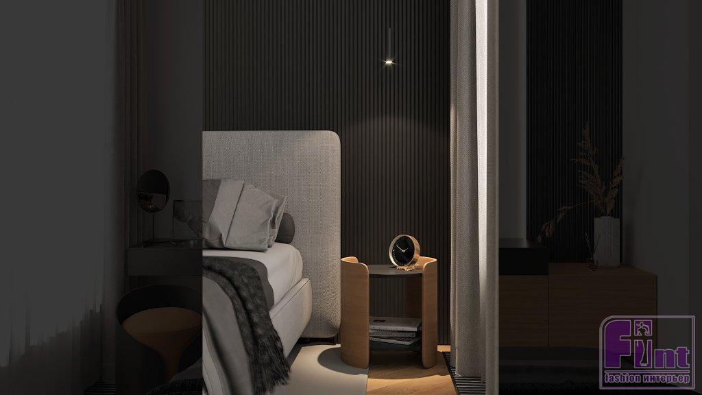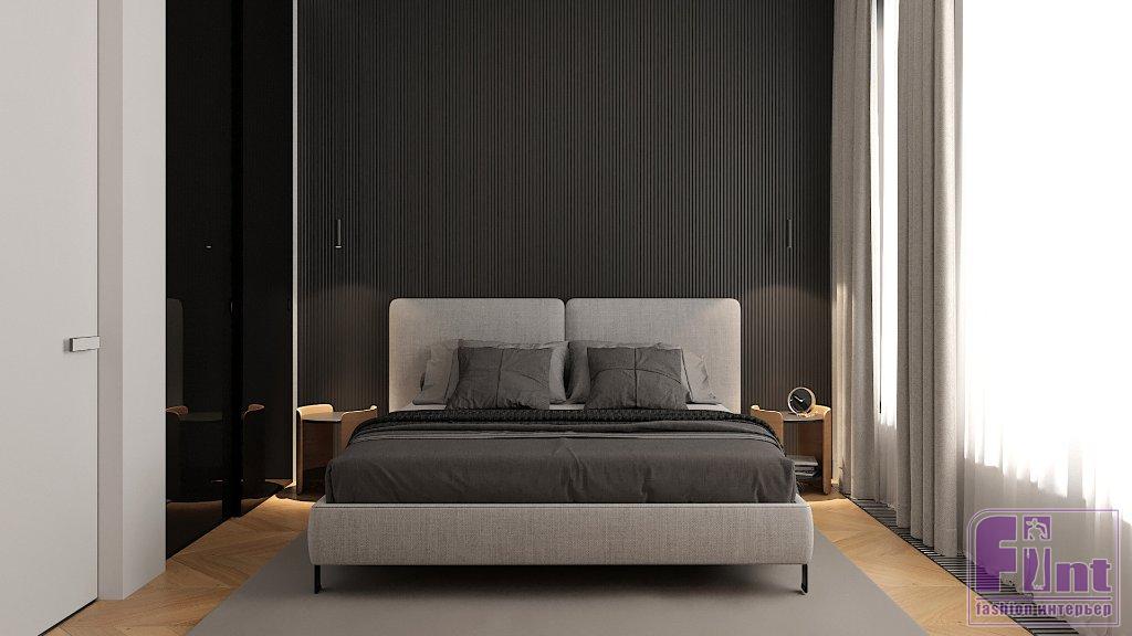 Хозяйская спальня также оформлена в монохромной палитре, присущей всему проекту. Прикроватные тумбы и пуфик в спальне выполнены на заказ в едином стиле. На полу под кроватью и в прилегающей зоне расстелен неприметный ковёр с низким ворсом светлого серого оттенка. Чёрный потолок в ванной перекликается с отделкой потолка в прихожей.