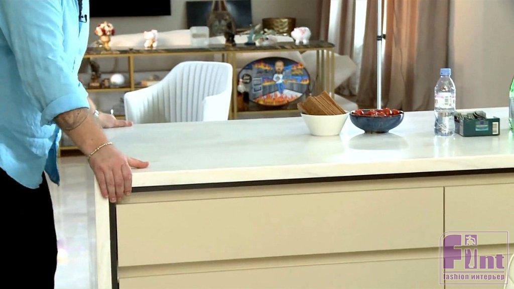 Константин выбрал линейную мебель с большим островом, изготовленную из МДФ. Нижние шкафчики и ящики светло-молочного оттенка дополнены сенсорными ручками и бесшумными доводчиками. На белоснежной столешнице из кварцевого агломерата установили чёрную газовую поверхность с чугунными решётками. Над ней закрепили мощную встроенную вытяжку.