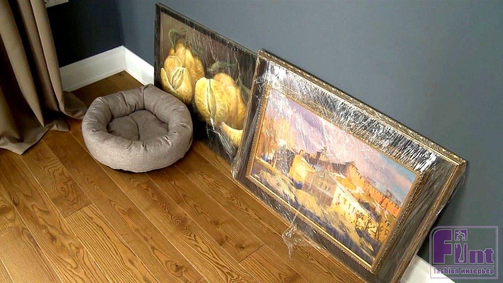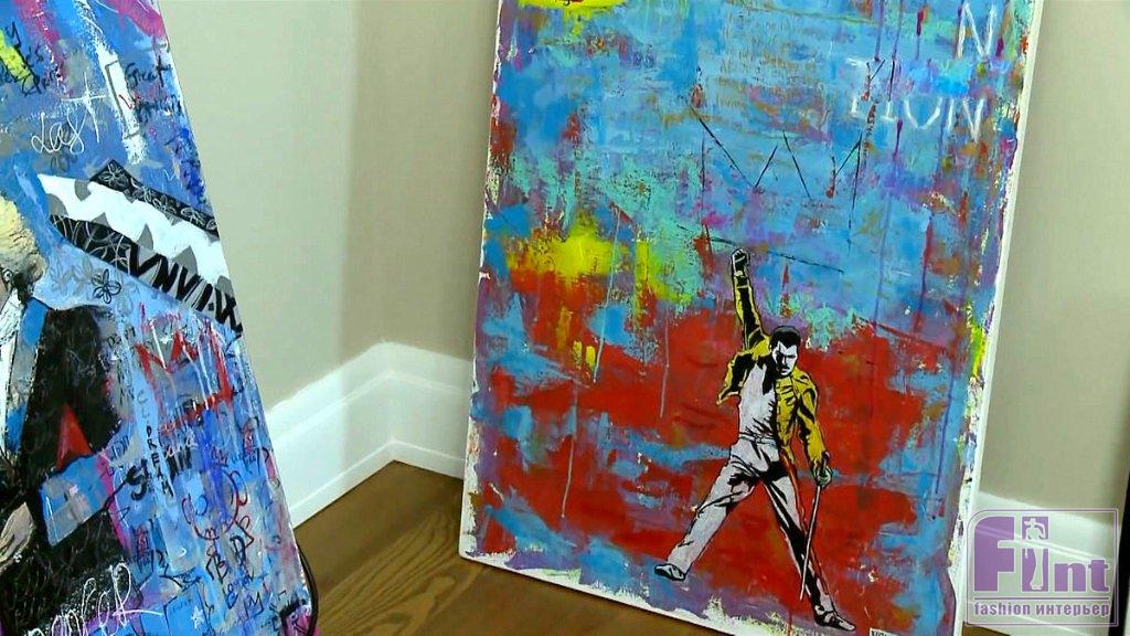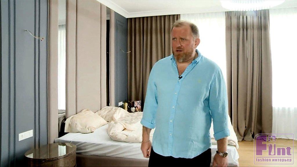 По обе стороны от кровати поставили оригинальные тумбочки овальной формы с глянцевыми поверхностями. Окно декорировано традиционным комплектом из белоснежного тюля и однотонных штор в песочной гамме. В последнее время Константин увлёкся живописью. Его работы украшают все комнаты, а также многие холсты он дарит близким друзьям в подарок.