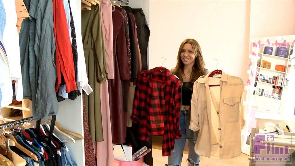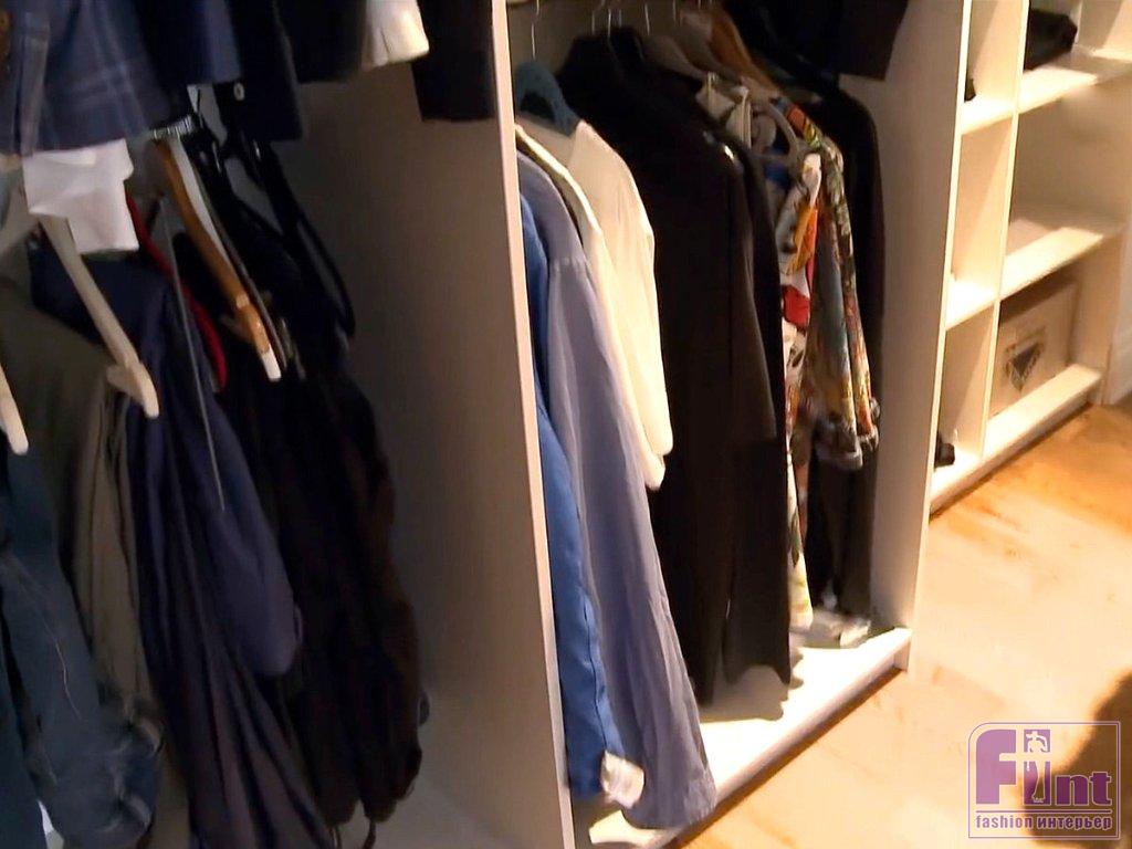 Константин сделал неожиданный презент своей спутнице. Он подарил ей просторную гардеробную, которой у девушки никогда не было. Помещение оформили в светлой гамме, на пол уложили паркетную доску. Комнату при помощи открытого стеллажа разделили на две части для отдельного хранения вещей и обуви. Возле окна поставили огромное зеркало с подсветкой и небольшой стол с ящичками, в которых гранятся аксессуары и бижутерия.