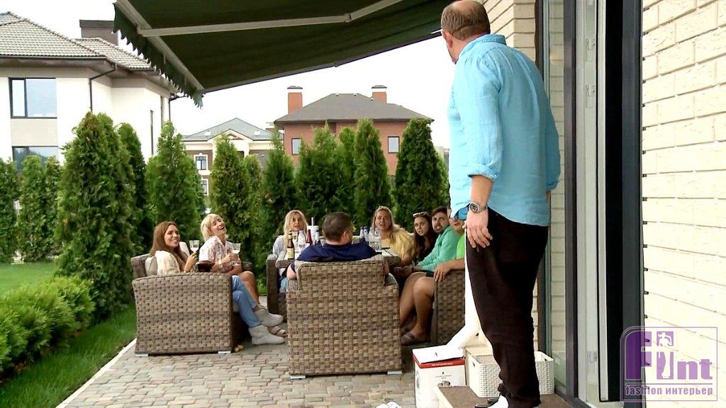 На террасе возле дома Константин оборудовал уютную зону отдыха. Под навесным маркизом он поставил удобную мебель из искусственного ротанга, а также барбекю. От посторонних глаз гостей дома закрывают высокие туи. Участок засеян газонной травой, в дальнейшем шеф-повар планирует пригласить ландшафтных дизайнеров, чтобы они помогли благоустроить территорию.
