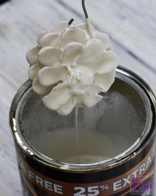 Затем покрасьте все шишки, используя один из распространённых методов окрашивания шишек. Проще всего покрасить шишки можно методом обмакивания. Для этого вам потребуется обычная толстая проволока или жёсткий электрический провод. Надёжно закрепите шишку на конце проволоки и окуните шишку в краску. Дайте излишкам краски стечь, и оставьте шишку до полного высыхания.